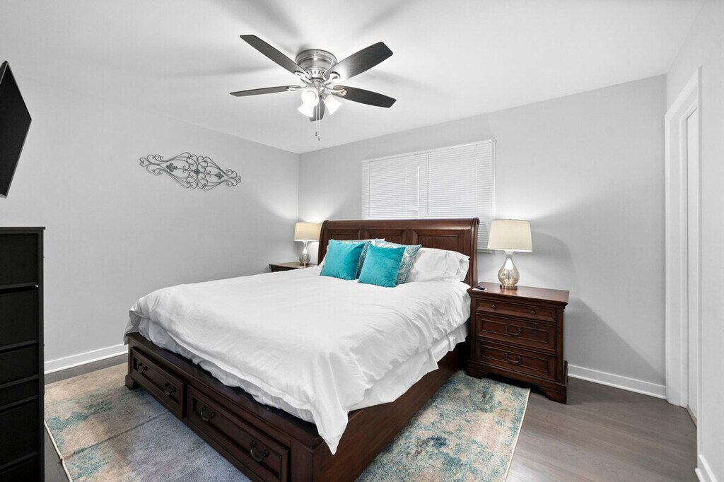 Feel at home in this 5-bedroom home, located 21 minutes away from downtown Naperville. This single-family home includes garage parking and additional driveway parking, if needed. This home is equipped with plenty of kitchen utensils, including cooking spices and oils. For entertainment, there is an arcade cabinet with 2000 classic games and a pool table. Technology includes seven LCD televisions, all with access to Hulu, Disney, and ESPN streaming services (English and Spanish), Netflix and Prime Video access (your log-in), 150 Mbps internet speed with an ethernet hard line available, and Wi-Fi throughout the entire home. There is a 55" TV in the living area, a 50" TV in the gaming area, and 40" TVs in the bedrooms. A sound bar is available in the living room. For children, there is one pack and play sleeper, one stroller, one high chair, and one booster seat. Cards and game options are also available. Downtown Naperville is like a bustling mini Chicago, including a beach and plenty of bars and restaurants. If the home has a fireplace, it is not for guest use. [SI]