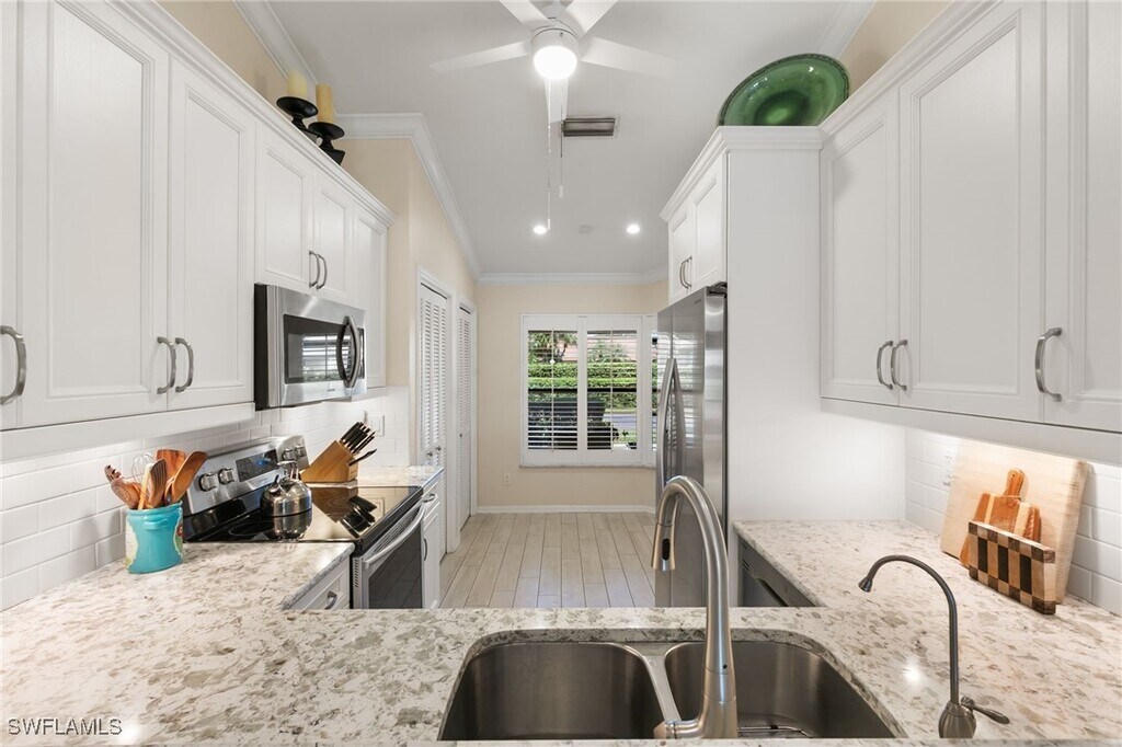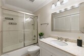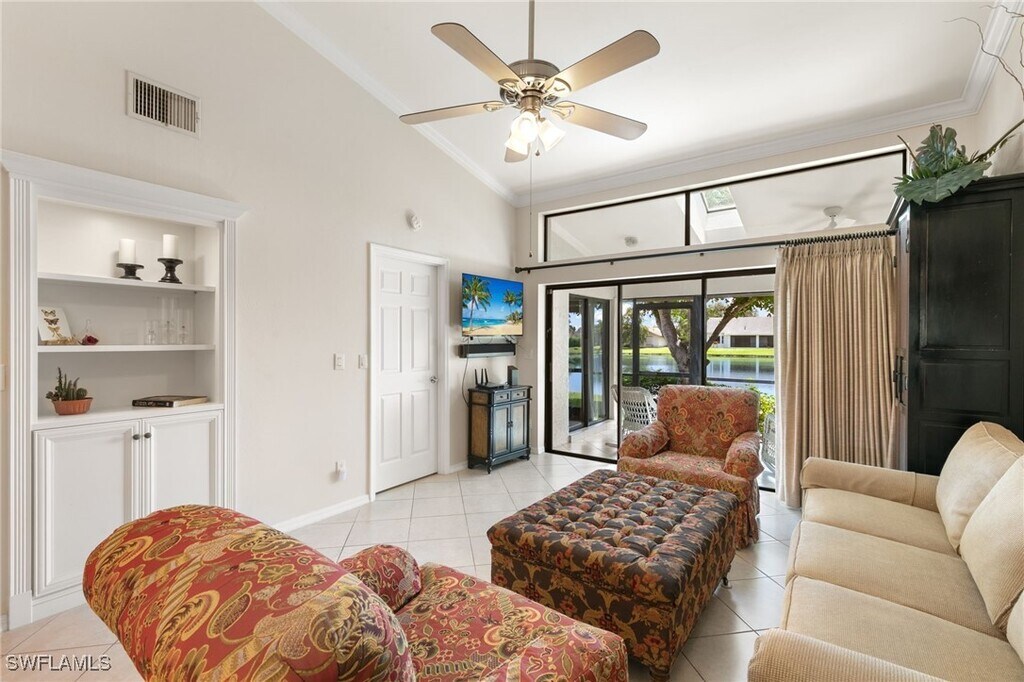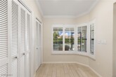 Highly sought-after lake view attached villa in the desirable community of Regent Park. This south-facing 2-bedroom,2-bath home offers beautiful sunset views and has been extensively updated throughout. The kitchen has been completely renovated with new appliances,cabinetry,countertops,flooring,and a built-out pantry. Both the primary and guest bedrooms feature custom closets,while the bathrooms have been upgraded with quartz countertops,new vanities,sinks,faucets,flooring,a new shower with glass door in the primary bath,and a new glass door in the guest bath. Additional updates include custom shelving in the laundry room,plantation shutters throughout,a built-in bookshelf in place of the former wet bar,a water filtration system installed in 2021,and brand-new automatic hurricane shutters on the front of the unit in 2025 for added peace of mind. The community has also undergone recent improvements with a new roof,awnings,unit numbers,and carports completed in 2023. Regent Park residents enjoy access to a community pool,tennis courts,and pickleball,all in a convenient North Naples location close to beaches,shopping,dining,and entertainment.