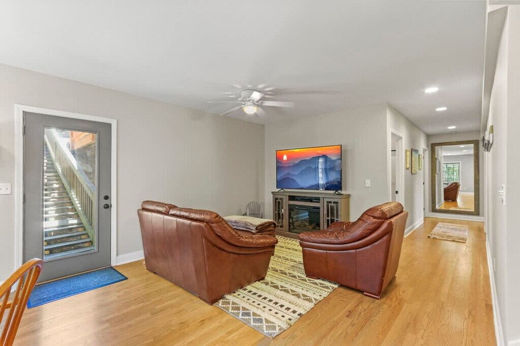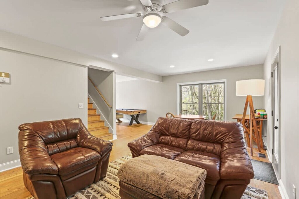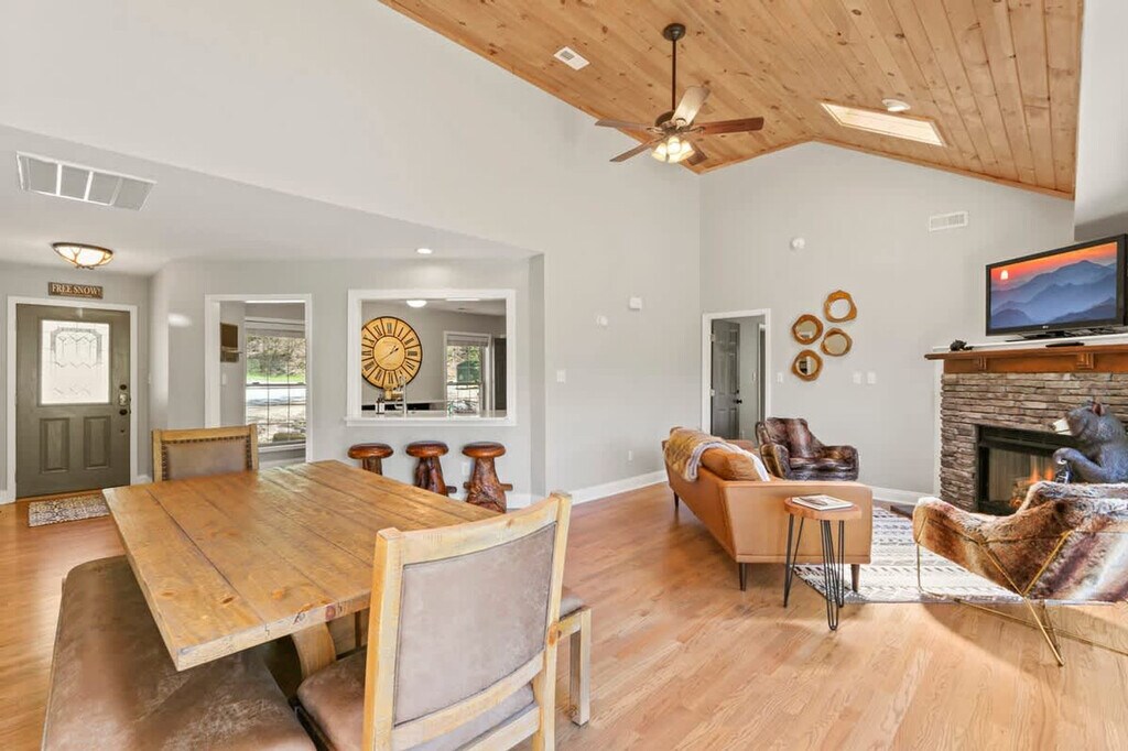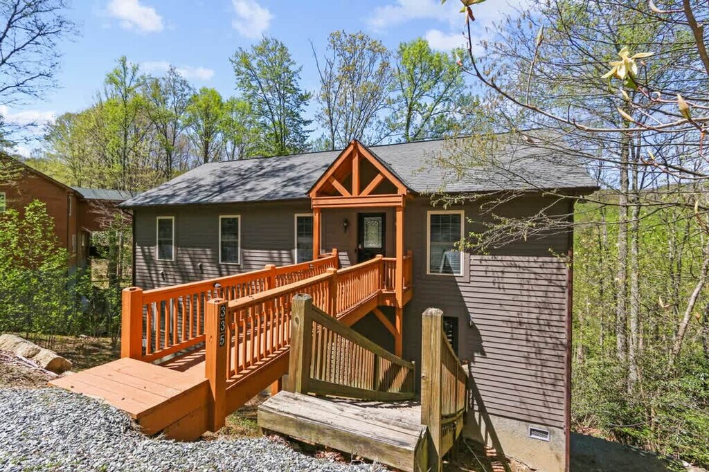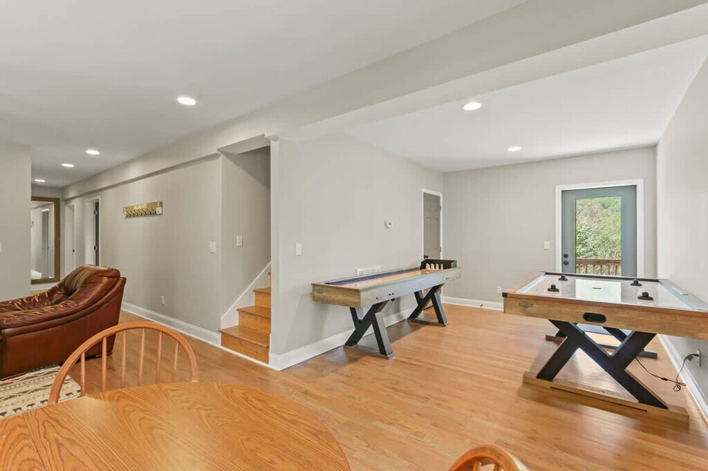 Welcome to this gorgeous newly renovated home in Beech Mountain, perfect for a large family getaway. This two-story cabin offers a spacious open-plan living area with modern amenities, two living areas, and a game room for entertainment. With four comfortable bedrooms, each with private bathrooms, and stunning mountain views from multiple decks, you'll feel at home in this beautiful setting. Step into this fairy tale cabin where immaculate open space meets modern comfort. The cozy open-plan living area is designed with numerous modern amenities, including a fully equipped kitchen and an inviting dining area that opens onto an attractive living room. Upstairs, the living room features comfy couches, a cozy fireplace, and access to the outdoor deck. Downstairs, enjoy a gaming area with shuffleboard and air hockey. The kitchen is a chef's dream, complete with a microwave, stove, oven, refrigerator/freezer, coffee maker, dishwasher, and all necessary cookware and utensils. The large dining area is perfect for home-cooked meals, with seating for up to 11 guests. Beech Mountain Club access is available for a $300 transfer fee. Bring your fur baby with you, limited to one dog under 50 lbs with a $150 pet fee. Early check-in and late check-out are subject to availability with a $25 per hour fee. The cabin is situated in the small vacation town of Beech Mountain, NC, offering a remote location with small-town charm. Enjoy nearby woodsy trails and a short drive to Lake Coffey for additional trails. The area provides plenty of attractions, including skiing, snowboarding, snow tubing, zip-lining, mountain biking, off-road ATVs, rafting, fly fishing, hiking, golf, fine dining, and shopping. Both Beech Mountain and Banner Elk offer these activities at your fingertips. Smoking is not allowed on the property. There is a security camera on the front door and in the driveway. Pets are not allowed. People other than those in the guest's party designated in the reservation may not stay overnight at the property. Keep the property and all furnishings in good order and only use appliances for their intended uses. There is no daily housekeeping service, and while linens are included, daily maid service is not included in the rental rate. [SI]