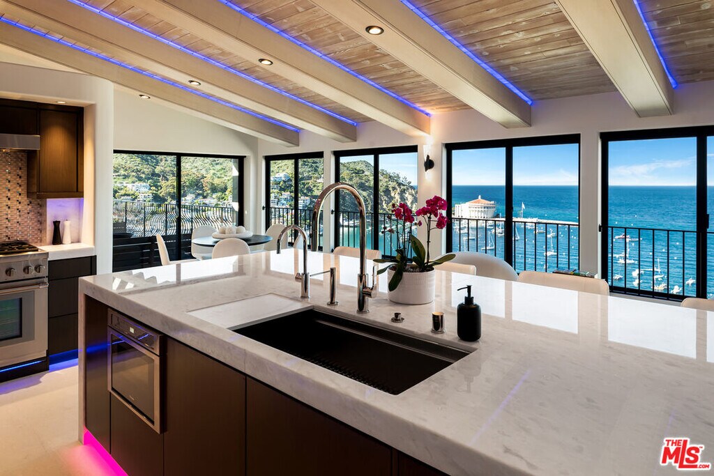 Experience the idyllic island lifestyle in this exceptional fully furnished estate, ideally located in the prestigious terraces of Avalon on Santa Catalina Island. Offering breathtaking, unobstructed panoramic views of the Pacific Ocean, Avalon Bay, and the town's most iconic landmarks including the Catalina Casino, Pleasure Pier, Holly Hill House, and Chimes Tower this residence offers a rare opportunity to lease one of Avalon's premier properties. This custom-designed two-story single-family home features approximately 4,400 square feet of living space, with 5 bedrooms and 6 bathrooms. The home showcases high-end European finishes throughout, including wood-beamed ceilings, custom tilework, and French limestone flooring, complemented by exceptional architectural detailing inside and out. The main level is designed for both comfort and entertaining, featuring an elegant living room with fireplace and glass doors opening to a view deck, a formal dining area, and a gourmet kitchen equipped with custom cabinetry, Italian marble countertops, premium fixtures, and top-of-the-line appliances. A spacious family room with built-in media center and fireplace, private office with built-in desk, laundry room, and powder room complete this level. The primary suite offers a luxurious retreat with fireplace, walk-in closets, private patio, and sweeping ocean views. The spa-inspired primary bath includes a soaking tub, walk-in shower with sauna, and dual vanities. The lower level includes three guest bedrooms two sharing a Jack-and-Jill bath and one with its own en-suite as well as a separate guest suite featuring a partial kitchen, private entrance, and its own deck. Outdoor spaces are equally impressive, with multiple terraced decks ideal for relaxing or entertaining, a private plunge pool, and beautifully landscaped grounds. Additional features include solar panels, ample off-street parking, and a golf cart for convenient access around town. Offered fully furnished, this is a rare lease opportunity to enjoy elevated coastal living just a short boat or helicopter ride from the mainland. Price and Deposit could change due to time of season on rental. Please call listing broker for pricing and availability. MLS ID 26697671