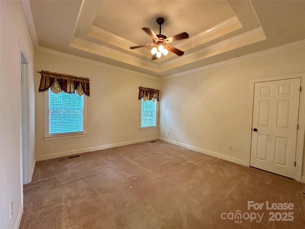 Open concept 3BR/2BA home with large deck,private tree-lined backyard on a corner lot. Conveniently located nearby grocery and shopping. Spacious floorplan with hardwood floors in GR and Kitchen. Primary ba with tray ceiling,separate shower and garden tub,large walk-in closet. Ceiling fans in all brms,SS smooth-top stove,microwave,dishwasher and gas fireplace. Washer / dryer and fridge included. Private tree-lined backyard and ready for a new tenant.