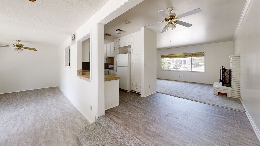 .5 This home features a big bright family room with a brick fireplace. A long galley like kitchen with white cabinets and tile counter tops that over looks into a second family room or dining area with ceiling fans. Off the kitchen is the laundry room with extra storage. Three nice sized bedrooms all with ceiling fans. Newer carpet and vinyl throughout. Has nice sized deck off the back off the house with stairs down to the yard. It also has a 2 car garage with lots of storage. Utility Included Trash. Tenant responsible for Water, Sewer & Gardener. Small dogs only on owners approval.
