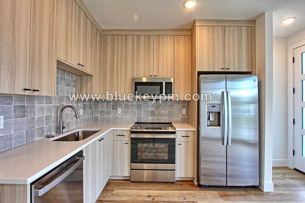 Townhome in North Portland's Arbor Lodge neighborhood located close to the Columbia Park & Annex, the University of Portland and New Seasons Market. This beautiful townhome features an open floor plan, stainless appliances, wood floors, large floor to ceiling windows, a fully fenced patio of the dining area and stackable washer and dryer on second floor. This home has 2 spacious bedrooms with private bathrooms and double doored closets. One of the bathrooms has a tub/shower combo and the other has a walk-in shower. Tenants pay all utilities. Patio areas are maintained by tenants. The common grounds are maintained by landscape services. No pets please. View our VIDEO tour on our website at Applications are online at our website Call Blue Key Property Management, Inc. at to schedule a showing Monday-Friday 9 am to 5 pm. $2195 Rent, $2195 Security deposit, $55 non refundable screening fee per adult age 18 and older. Renter’s insurance required. For available homes, more information, rental criteria, video tours or online applications visit Blue Key Property Management, Inc. licensed in WA and OR. 3356 N. Russet Street, Portland, OR 97217
