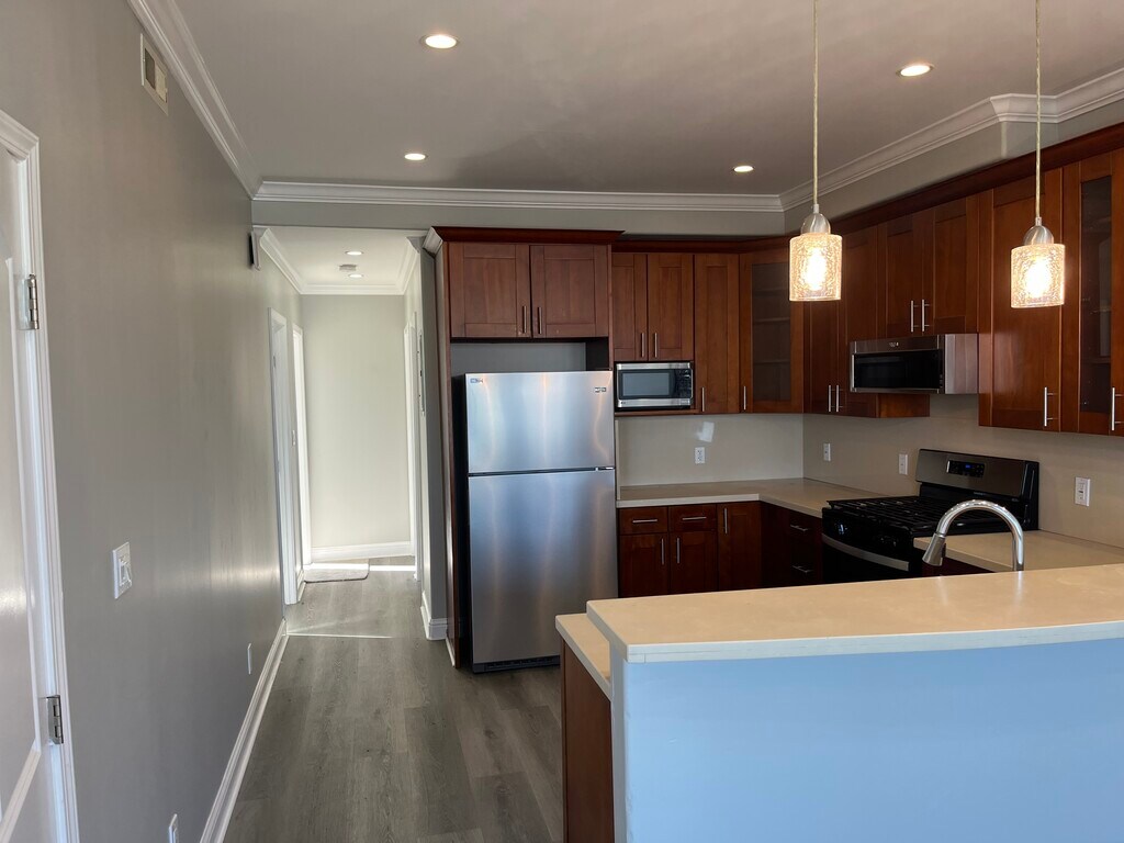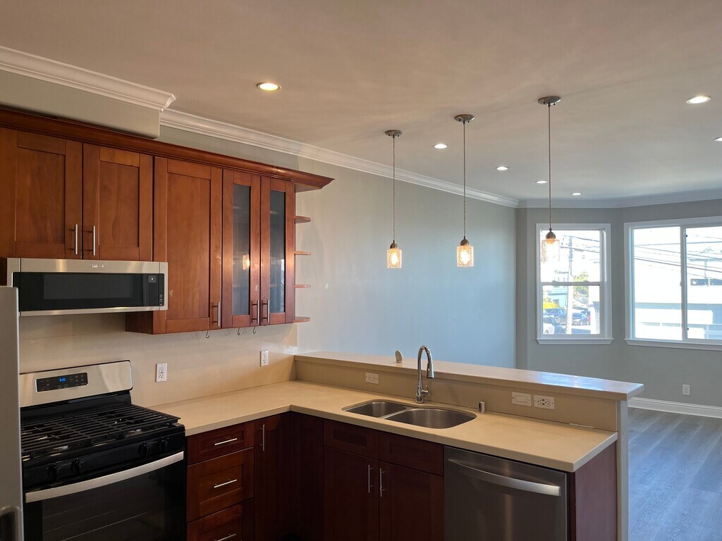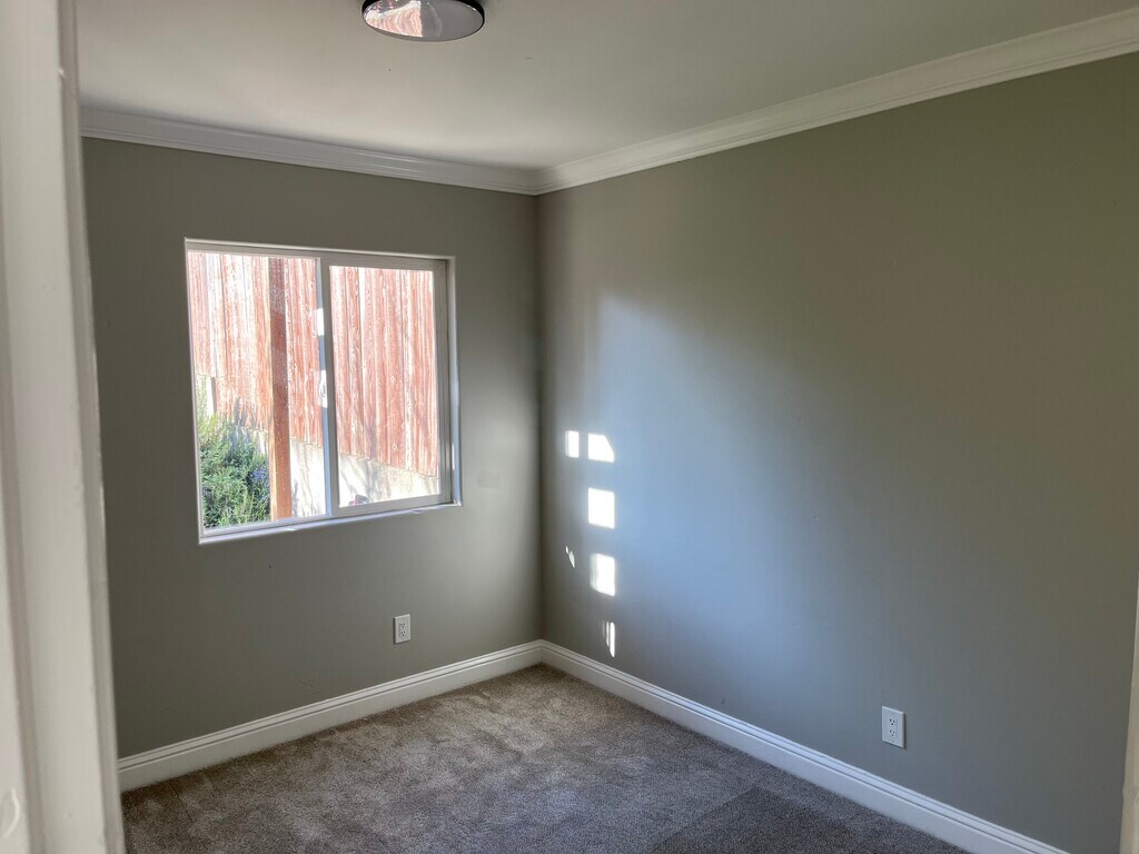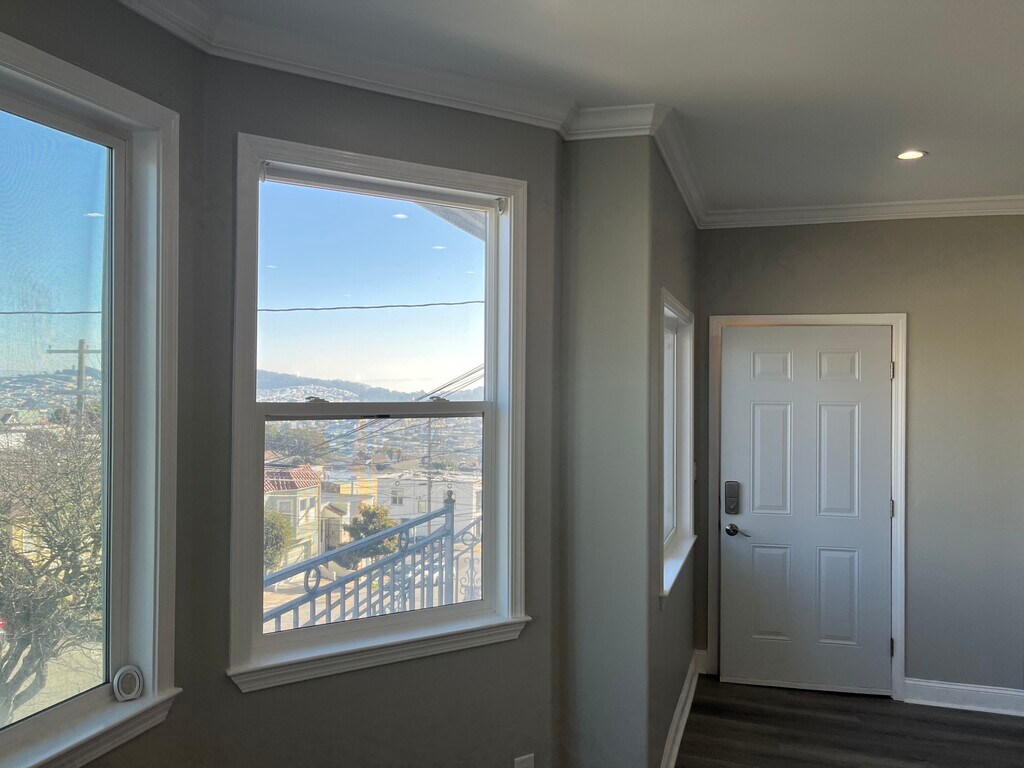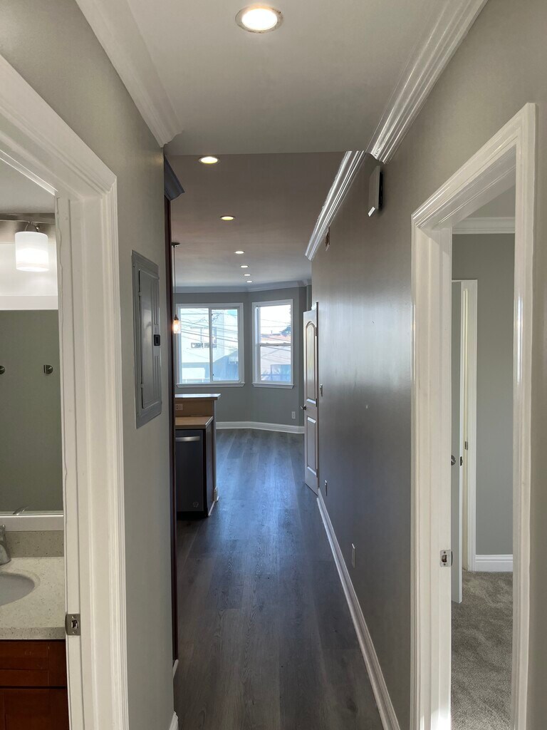 Completely remodeled flat in the Balboa Park neighborhood. All new appliances: Gas range, dishwasher, fridge and built in microwave. All new vinyl plank flooring in living spaces and upgraded carpet in bedrooms. All new fixtures throughout. Residential neighborhood with walking distance to K, L, M, 44, and Bart. Laundry on site. Walk in pantry in the kitchen. Walk in closet in the master bedroom. Views of the bay. Must have good credit, employment history and references. Backyard for the use of the unit; has mature fruit trees and spaces to garden on your own. Backyard is secure from street access.