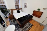 Feel at home in this charming Midtown West 3-bedroom, 1-bathroom furnished apartment. This centrally located apartment is fully equipped with all the basics and necessities for your convenience. This full-floor apartment features 3 comfortable and well-maintained bedrooms. Two bedrooms feature queen-size beds, while the third has a double bed. The living room space includes a sofa and a dining table for 4. You can walk to restaurants, bars, the Hudson River, Times Square, and Chelsea from here. Includes a dedicated work desk and Wi-Fi.