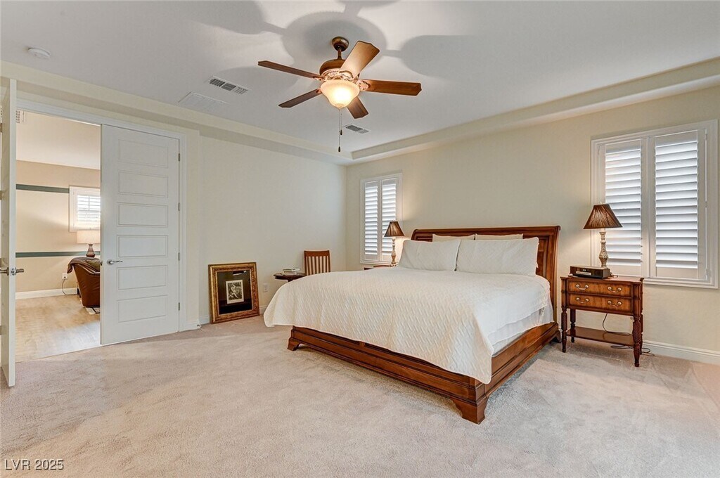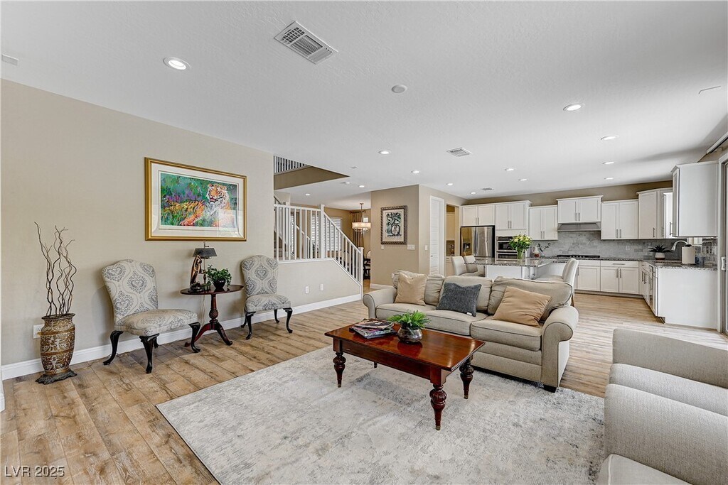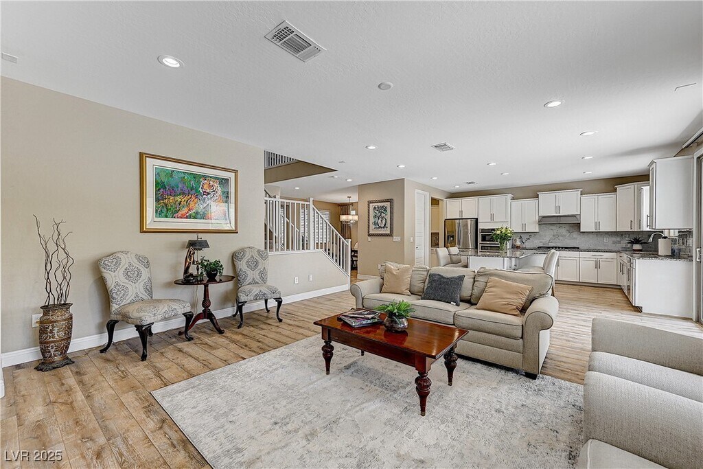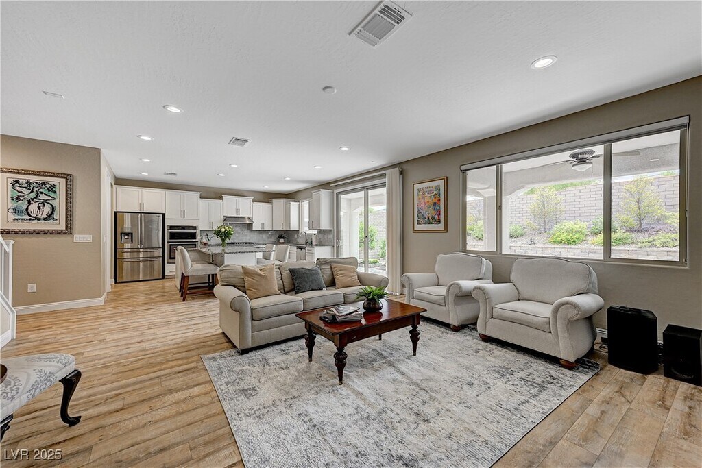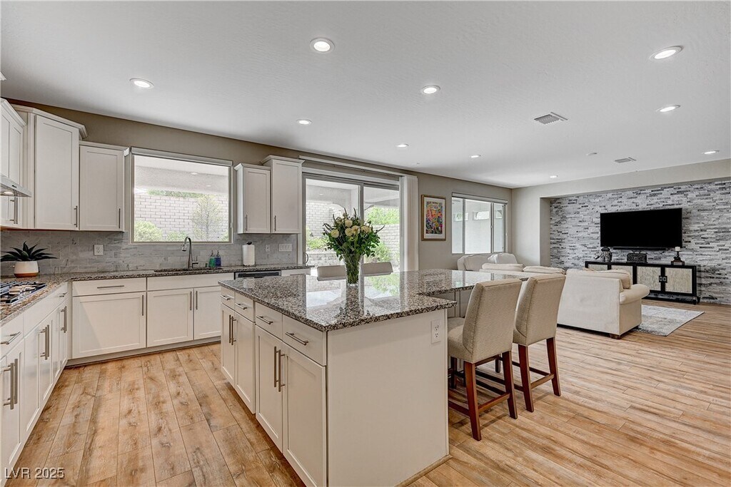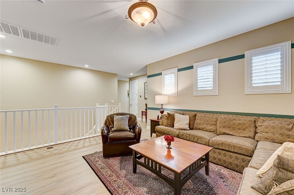Located in a desirable gated Summerlin community, this beautifully upgraded 4-bedroom, 3-bathroom home with a den and loft offers the perfect blend of style and comfort. The open-concept living area features stone accent walls, custom paint, luxury vinyl flooring, and plantation shutters throughout. The modern kitchen is a chef’s delight with a large center island, granite countertops, stainless steel appliances, and plenty of cabinet space. Downstairs includes a private den—ideal for an office or gym—and a guest bedroom with a full bath, perfect for visitors or multi-generational living. Upstairs, the spacious primary suite boasts a balcony with stunning mountain views, a walk-in closet, and an elegant ensuite bath. The loft area provides additional flexible space for lounging or entertainment. Enjoy outdoor living in the low-maintenance backyard, complete with a covered patio and paver design—perfect for relaxing. Located near top-rated schools, parks, trails, and Downtown Summerlin.