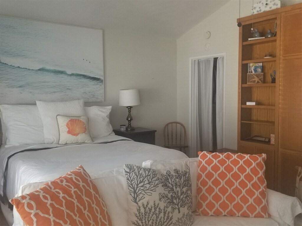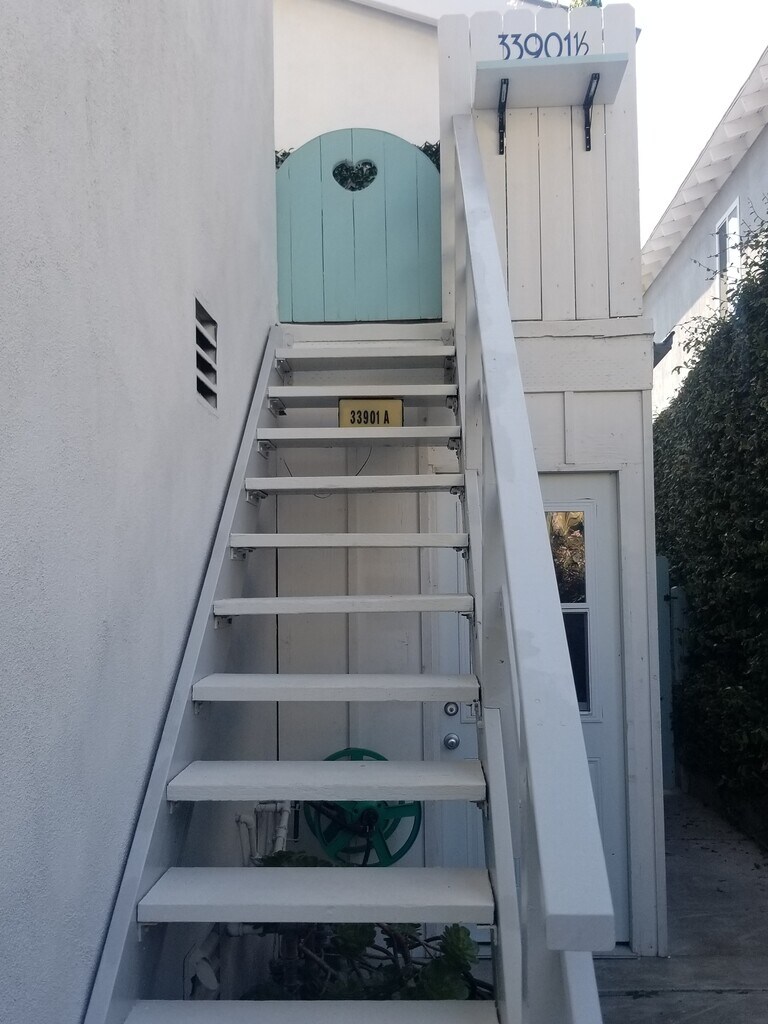 An extra-large Studio with a view of the ocean in the distance. The vaulted ceilings add to the spaciousness of the well-appointed Studio and the extra large windows let the light pour in for a bright home. Upstairs you can enjoy coffee on your cozy and private patio. Get a restful sleep on a Duxiana bed and a feather bed is available if you want a softer bed experience. Saturday morning walks to the Farmer's Market and pick up fresh fruit, vegetables, coffee, and one of the best croissants in town. In the evening you can hear the seals off in the distance reminding you that you are enjoying beach-style living. During the summer enjoy the concerts and movies in the park. The Studio has ample space, a floor-to-ceiling storage unit, a ceiling fan, large windows with blackout curtains, a walk-in closet, a TV, extra fast wifi, and a complete kitchen with a full-size refrigerator, stove/oven, toaster oven, coffee maker, toaster oven, microwave and kitchen essentials. The unit has a designated parking spot &; street parking. You can walk to the grocery store, coffee shops, restaurants, Dana Point Harbor, Doheny Beach, and more. Small dogs (under 15 lbs) with pictures are allowed with a pet fee. No cats. No smoking of any items. No drugs.The owner pays for utilities (max $200), including a gardener and starter toiletries. Fully furnished, no smoking on the property, minimum three-month lease.Starter Kitchen Essentialsdish soap paper towels sponges etc.plates utensils pots/pans, coffee maker, etc.Cleaning productsSmoke DetectorCarbon Monoxide DetectorFirst Aid KitFire ExtinguisherFree Parking on Premises and parking on the streetClose to public transportationStairs to the Entrance of the PropertyPublic Bus System Uber Lyft. A free trolley in the summer will connect you with the free trolleys to San Juan Capistrano, Laguna Beach, and San Clemente.Linen Essentials HeatingFull-size ironing boardHair dryerRoom-darkening shadesPortable fansCable TVSmart TVFast InternetWiFiKitchenStovetopFull-size fridgeMicrowaveToaster Oven