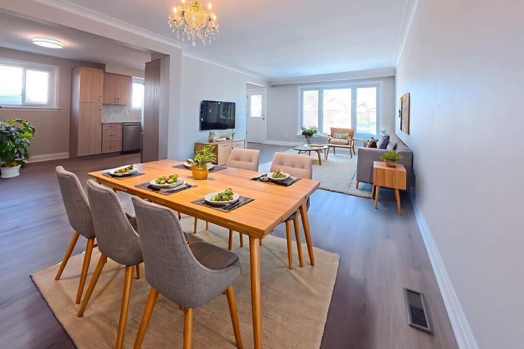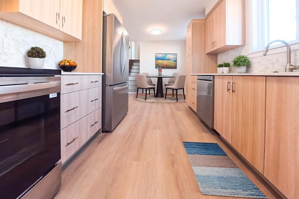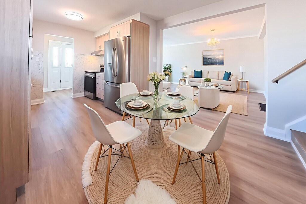 Thoughtfully renovated and filled with natural light, this three-bedroom upper-level residence offers a refined take on comfortable city living. Expansive windows illuminate the backsplit layout, highlighting premium wide-plank flooring, crisp white walls, and carefully selected modern light fixtures that create a cohesive, contemporary feel throughout.The eat-in kitchen is both stylish and functional, featuring sleek cabinetry, quartz countertops, and brand-new stainless steel appliances-ideal for everyday living and effortless entertaining. The open flow into the living and dining areas enhances the sense of space, while a large private balcony extends the home outdoors, perfect for morning coffee or evening downtime.Three well-proportioned bedrooms provide quiet, comfortable retreats, anchored by a generous primary bedroom. A spa-inspired bathroom with modern finishes and elegant tilework completes the interior. Freshly painted and meticulously updated, the home also offers ample storage and refined details that elevate the overall experience.Rent includes all utilities-water, hydro, heat, air conditioning, and gas-allowing for simple, predictable living. Ideally situated near schools, parks, shopping, and everyday amenities, with transit just steps away on Jane Street. Includes brand-new fridge, stove, dishwasher, in-suite washer and dryer, and one parking space.