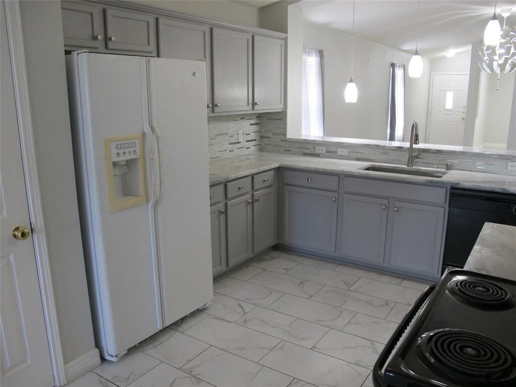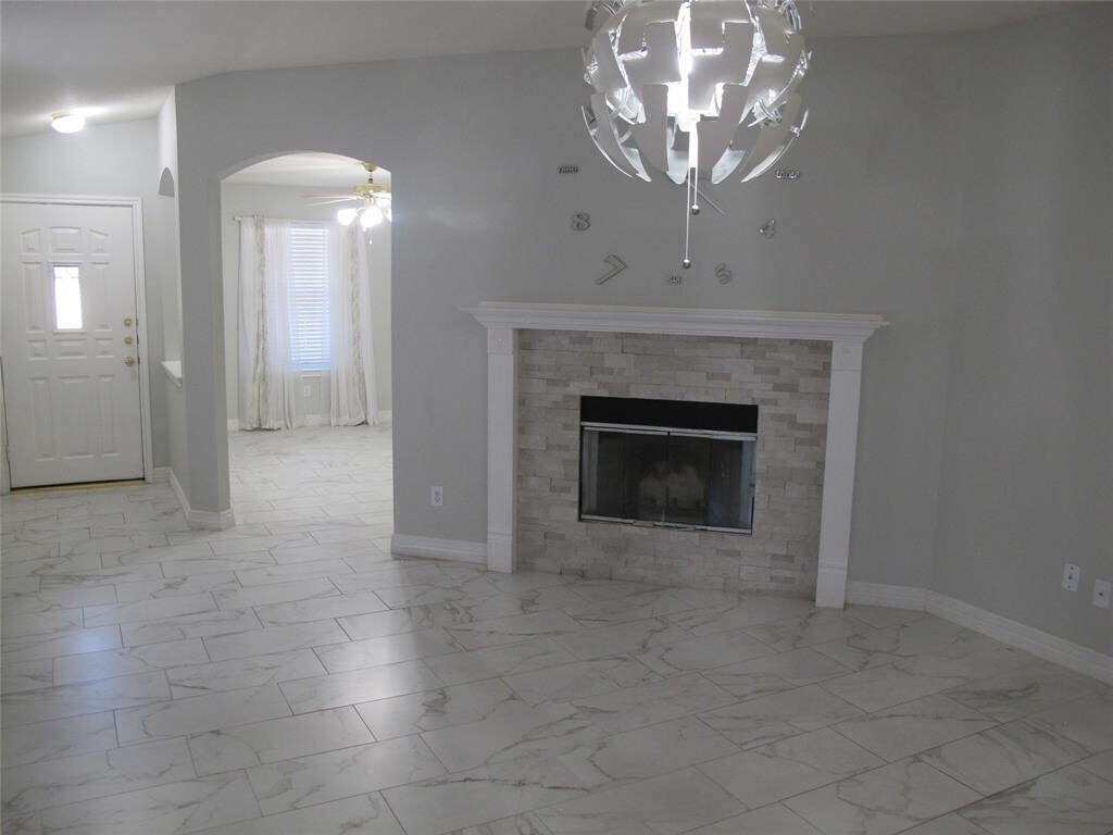 Great 3 bedroom, 2 bath home on a corner lot in the quiet Pioneer Crossing neighborhood! The family room has a wood burning fire[place and is open to the kitchen through the breakfast bar. The kitchen boasts light granite countertops with custom tile backsplash and a nice breakfast nook. The large master bedroom features faux wood flooring and includes an ensuite bath with double vanity, separate walk-in shower, soaking tub and a large walk-in closet. All bedrooms are equipped with ceiling fans. Marble-like tile throughout except the two secondary bedrooms which are carpeted. Nice fenced backyard with a covered patio. Two car attached garage with opener. Sprinkler system. Lease includes the refrigerator.