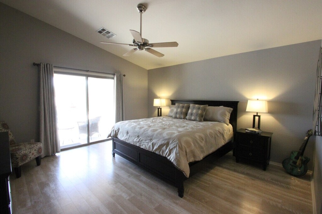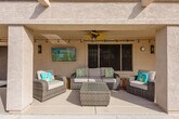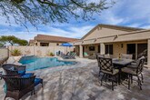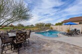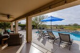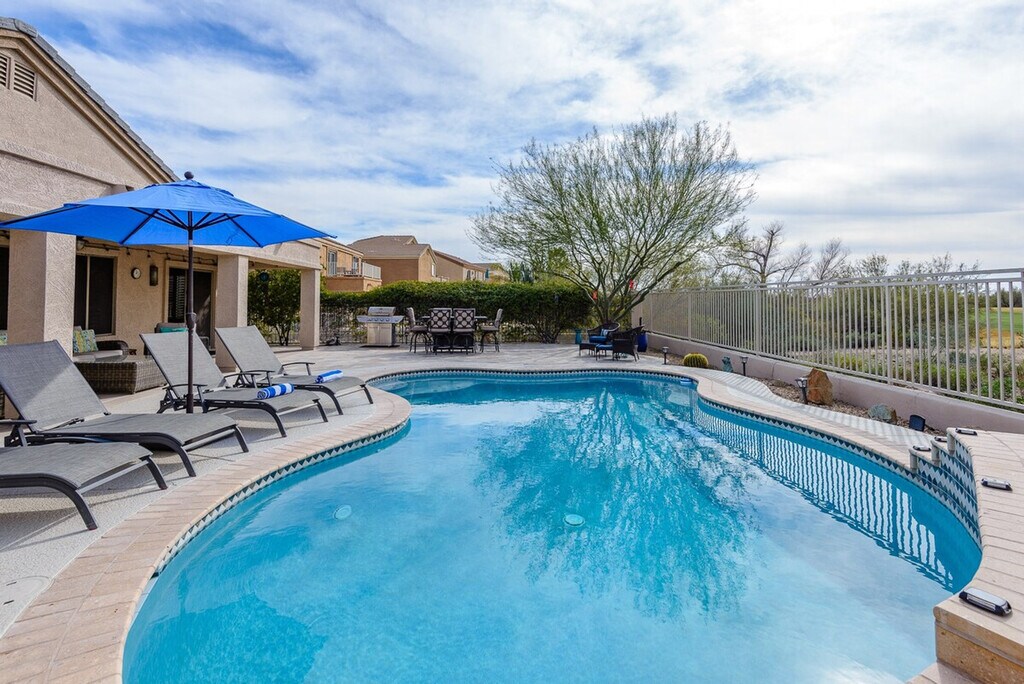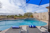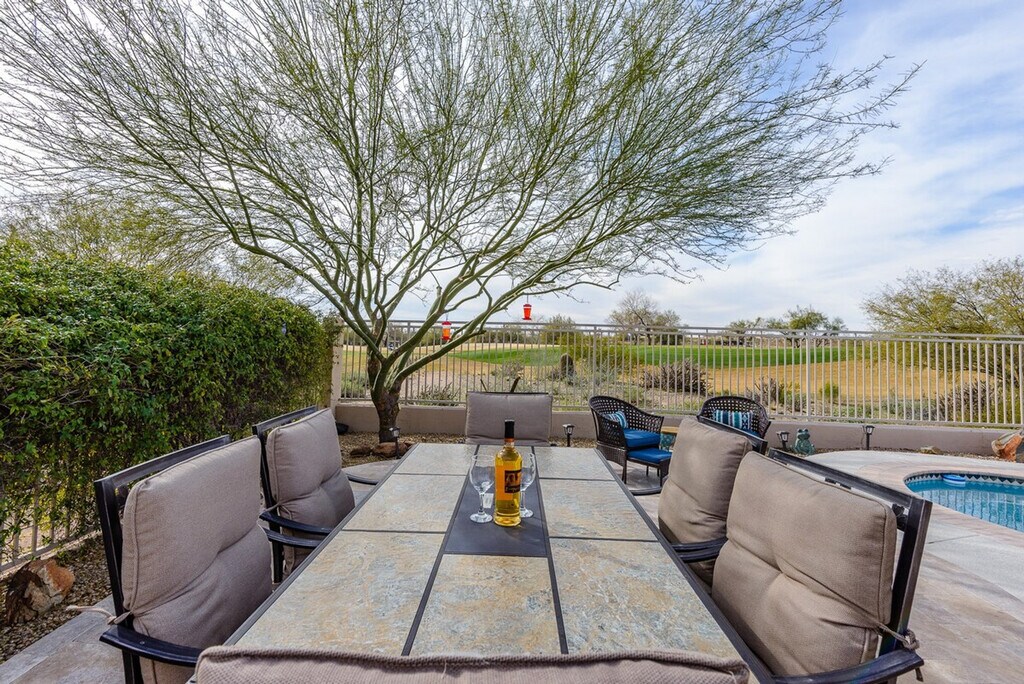 Welcome to Casa Cave Creek, a stunning 3-bedroom, 2-bathroom home overlooking the 2nd hole of the Dove Valley Ranch Golf Course. This single-level residence offers breathtaking western views for amazing sunsets, and features a spacious great room with new porcelain wood-grain tile, modern cabinets, and quartz countertops. The master bedroom includes a king-size bed, a large flat-screen TV, an attached master bath, a walk-in closet, and a slider for backyard access. The second bedroom has a queen bed and a TV, while the third bedroom can serve as an office or transform with a Murphy bed into a sleeping area with a real queen mattress. Additional sleeping arrangements are available on the queen sleeper sofa in the living room. Enjoy sunset cocktails around the fire-table or while dipping in the pool, with a large TV on the patio for entertainment. This home provides all the comforts you need, including all linens, bath and pool towels, and free Wi-Fi. The garage accommodates one car, with additional parking available in the driveway. Included in the rental are a set of men's and women's right-handed golf clubs and two bikes for your use. Located near the Cave Creek Regional Park, you'll have access to numerous walking, hiking, and biking paths. Take advantage of the included bikes for a ride. Golf enthusiasts will appreciate the proximity to Dove Valley Ranch Golf Club and Rancho Manana Golf Club. The pool cannot be heated in the winter and no pets are allowed. Guests are liable for any damages caused to the property. [SI]
