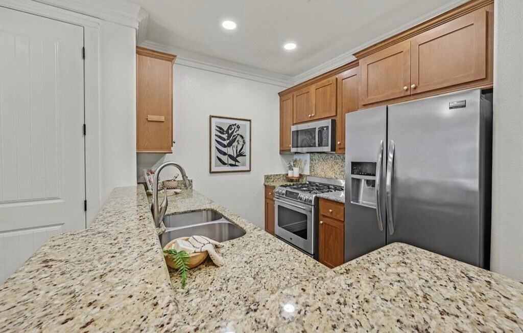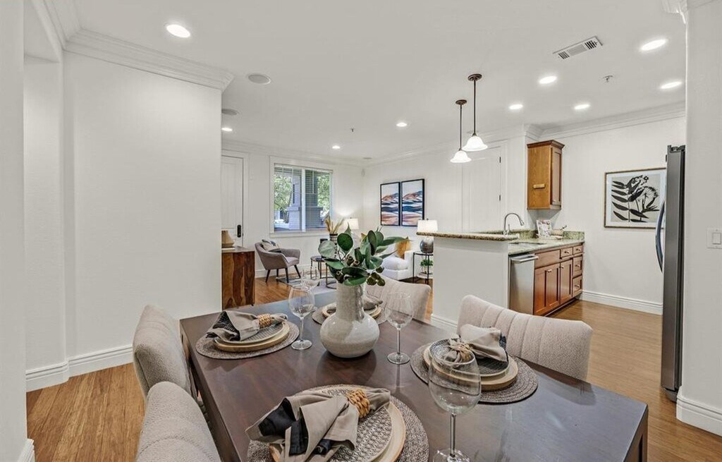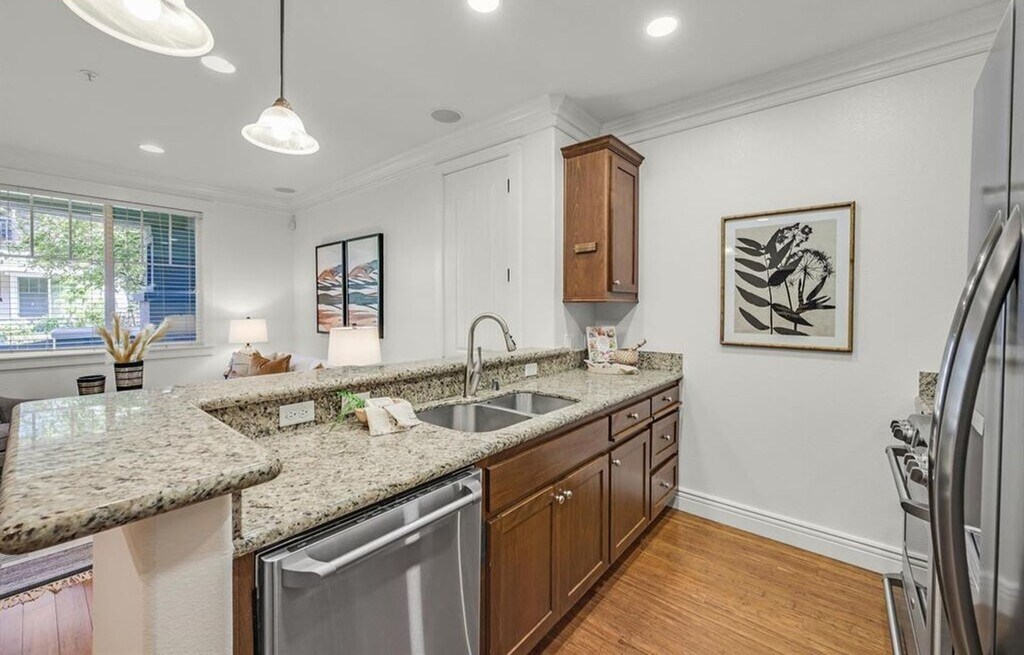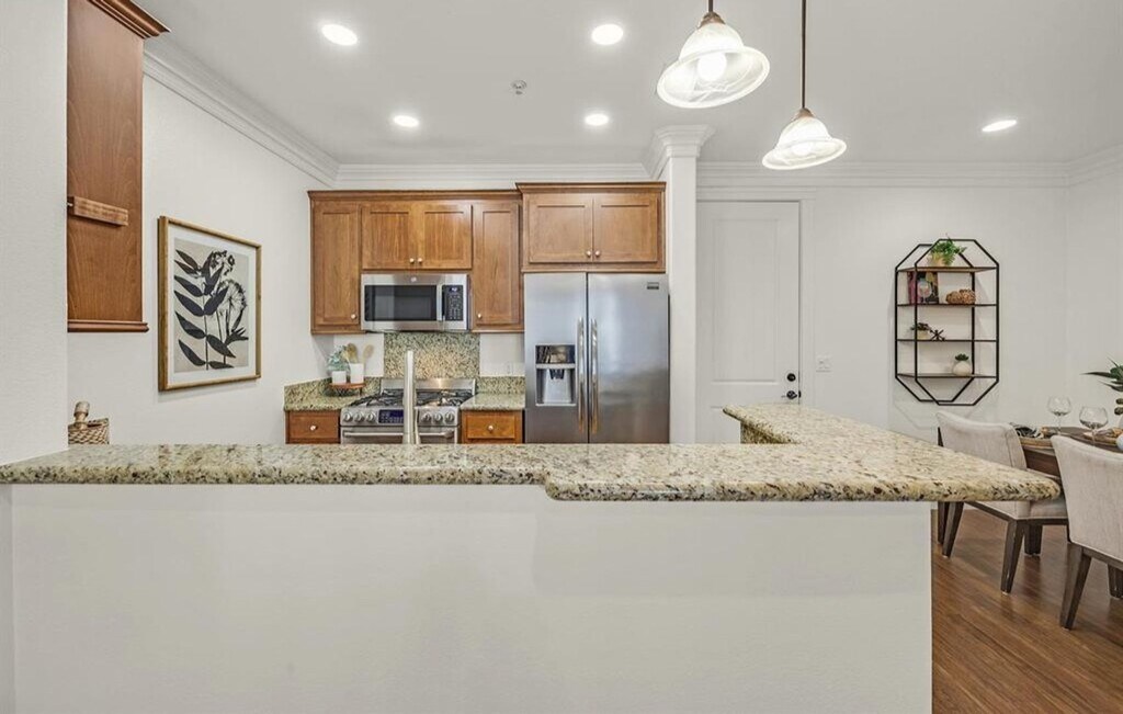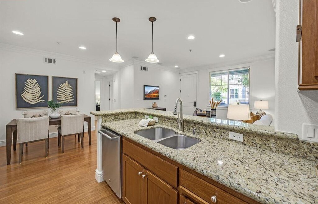 Live in luxury in this beautifully upgraded condo, ideally located just steps from the Iron Horse Trail. This ground-floor home offers 2 bedrooms, 2 bathrooms, an attached 1-car garage, and a deeded parking space. The chef’s kitchen features shaker-style cabinets, slab granite countertops, and stainless-steel appliances including refrigerator, gas range and stove, dishwasher, disposal, and microwave. A formal dining area sits just off the kitchen, opening into a light-filled living room with high ceilings and crown molding. From here, step out to your private gated patio overlooking the greenbelt. The gorgeous primary suite includes a walk-in closet with custom organizers, a ceiling fan, and a spa-like bathroom with an oversized shower. The second bedroom sits across from a full bathroom, making it perfect for guests or a home office. Additional highlights include: Hardwood floors Fresh neutral paint Wood blinds Laundry in the garage with washer and dryer included. Pets allowed with $500 added to deposit per pet. Up to $50 in water bill covered, over $50 is tenant responsibility. Tenant responsible for garbage bill. The home is not furnished. All this in a prime Danville location—close to Costco, shops, restaurants, freeway access, and award-winning Danville schools.