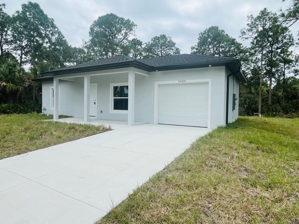 Welcome to your dream home in Lehigh Acres, FL! This brand-new construction is a one-bedroom, one-bathroom gem, ready for you to be the first to call it home. The property boasts a private setting with a large backyard, perfect for your pet-friendly lifestyle. Step inside to beautiful tile flooring throughout, complemented by modern lighting and fixtures. The chef's kitchen is a delight, featuring plenty of cabinets, a pantry, and wood shaker cabinets. The primary en-suite is a haven of relaxation with a large tiled shower. The home also features a one-car garage and storm protection-impact windows for your peace of mind. Enjoy the Florida sunshine from your covered rear lanai or through the large windows that flood the home with natural light. Conveniently located close to all amenities in Lehigh Acres, this home is one of the lowest priced new constructions in the area. Don't miss out, see it today! Photos may be of a different but similar model, for display purposes only.