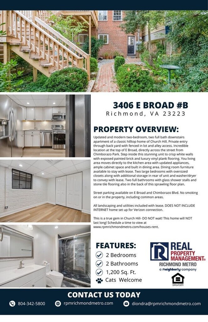 Welcome to this updated two-bedroom, two full-bath downstairs apartment nestled in a classic Church Hill hilltop home. Enjoy a private backyard entrance, fenced-in yard, and alley access. Unbeatable location at the top of East Broad Street, right across from Chimborazo Park—perfect for outdoor lovers and city living alike. Step inside this stunning unit to crisp white walls with exposed painted brick and luxury vinyl plank flooring. You living area moves directly to the kitchen area with updated appliances, ample cabinet space and built in dining area. Dining room furniture available to stay with lease. Two large bedrooms with oversized closets along with additional storage in rear of unit and washer/dryer to convey with lease. Two full bathrooms with glass shower stalls and stone tile flooring also in the back of this sprawling floor plan. Street parking available on E Broad and Chimborazo Blvd. No smoking on or in the property, including common areas. All landscaping and utilities included with lease. DOES NOT INCLUDE INTERNET/CABLE home set up for Verizon connection. ***The Real Property Management Richmond Metro Resident Benefit Package is designed to provide convenience, professional services, and cost savings to our residents. By applying, Resident(s) agree to be automatically enrolled in the program and agrees to pay an additional $45 per month, payable with rent. This program includes: - HVAC filter delivery every 90 days, which will help you save up to 15% on monthly heating & cooling bills (where applicable) - $1M Identity Protection, coverage backed by AIG - 24/7 online maintenance reporting aimed at making reporting those pesky maintenance issues easy and timely - Home buying assistance for when the time is right to buy your "forever" home - Access to your account and documents through our easy-to-use online portal with One-click payment options to stay up to date on rent, utilities, and more - Credit reporting to help boost your credit score with timely rent payments! -Resident Rewards Program, receive gift cards, and exclusive discounts when you pay rent on time - Utility concierge services to help make sure you get the best value on your utilities and conveniently activate utility, cable, and internet services - Vetted Vender Network, everyone who services your home is screened for insurance, licensing, and professionalism for the job Applications are processed first come, first serve. We only process completed applications. We consider an application complete when all persons planning to live in the home have applied. We will continue to show the property until we have a signed Lease. Non-refundable $60 application fee for all applicants 18 or older to apply and $250 lease administration fee due at lease signing. Pets considered on a case-by-case basis. If you have a pet, you will be required to pay a non-refundable $250.00 Pet Administration Fee per pet due at Lease signing. Security Deposit alternative offered. In addition to this fee, you will also have monthly pet admin fees per pet. The amount of the pet fee is determined based upon the "Paw Score" that assigns to your pet. (5 Paws - $25.00/month, 4 Paws - $30.00/month, 3 Paws - $40.00/month, 2 Paws - $50.00/month, 1 Paw - $75.00/month). THIS IS A REQUIRED PART OF THE APPLICATION PROCESS FOR ALL APPLICANTS. ** To schedule a SHOWING or SUBMIT AN APPLICATION please do so on our website ** Professionally managed and offered by Real Property Management - Richmond Metro Agent: LaVell Ragsdale-Bower Real Property Management - Richmond Metro adheres to all fair housing laws and regulations. (RLNE7052327) By submitting your information on this page you consent to being contacted by the Property Manager and RentEngine via SMS, phone, or email.