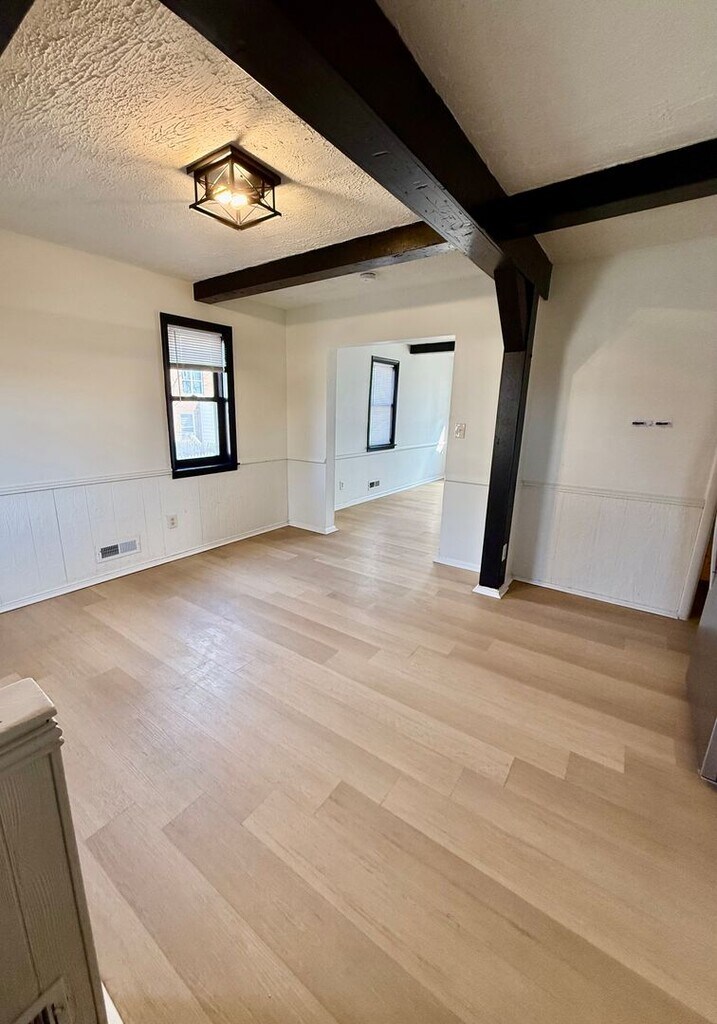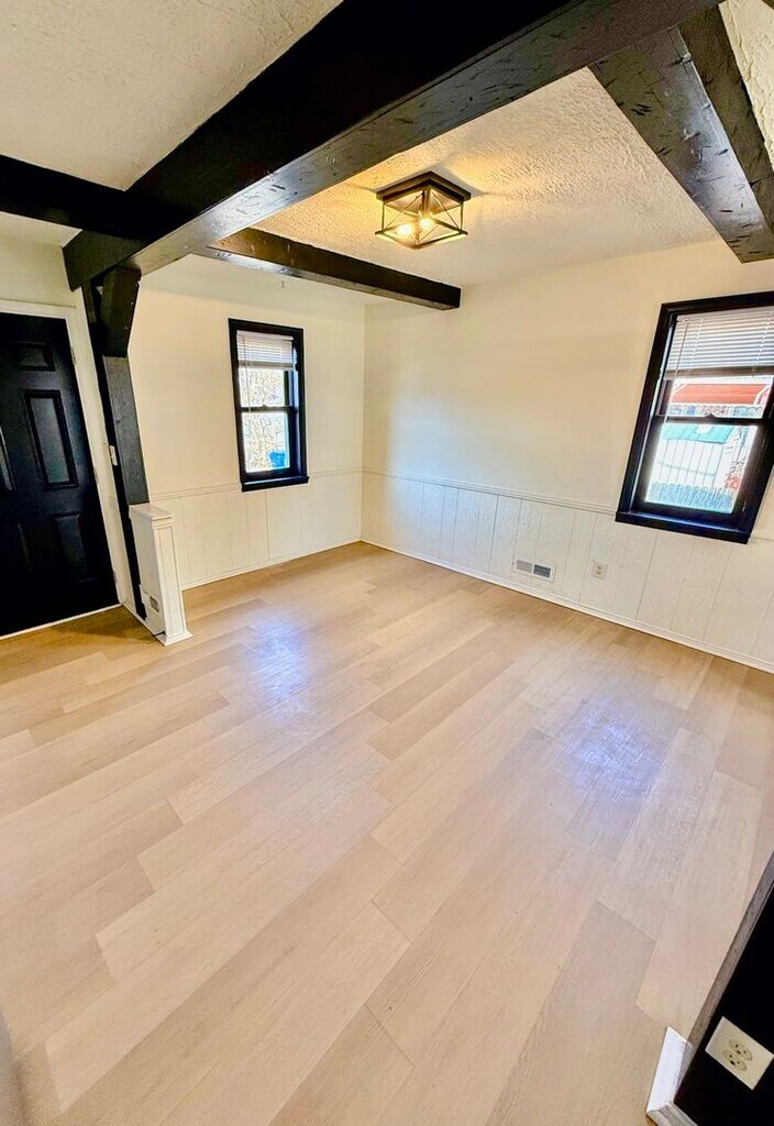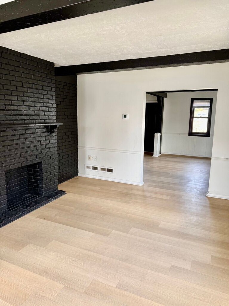 Welcome to this stunning 4-bedroom, 2-bathroom home located in the heart of Baltimore, MD. This fully remodeled corner lot property boasts a range of modern amenities that blend seamlessly with its unique architectural features. The kitchen is a chef's dream with stone countertops and modern cabinetry. The living room, with its exposed beam ceilings and brick accent wall, exudes a warm and inviting atmosphere. Real hardwood flooring flows throughout the home, leading to the modern tiled bathrooms. The finished basement offers additional living space, perfect for a variety of uses. The home also features a washer and dryer, ceiling fans, and central heat and air conditioning for your comfort. Step outside to the large outdoor deck overlooking a gated backyard, an ideal space for entertaining or simply relaxing. This home is a perfect blend of style, comfort, and convenience.