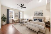 Modern studio at Dixon Mills featuring hardwood floors, an open layout, and a contemporary kitchen with stainless steel appliances, granite countertops, and ample cabinet space. Residents have access to a full fitness center, indoor basketball court, sauna, landscaped courtyards with seating and BBQ grills, and an on-site concierge office for packages. Water and cooking gas are included in the rent. Minutes to the Grove Street PATH, Pedestrian Plaza, restaurants, cafés, parks, and more.