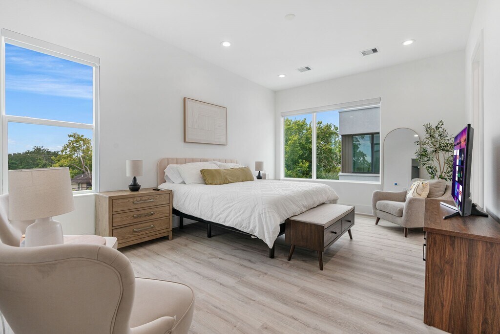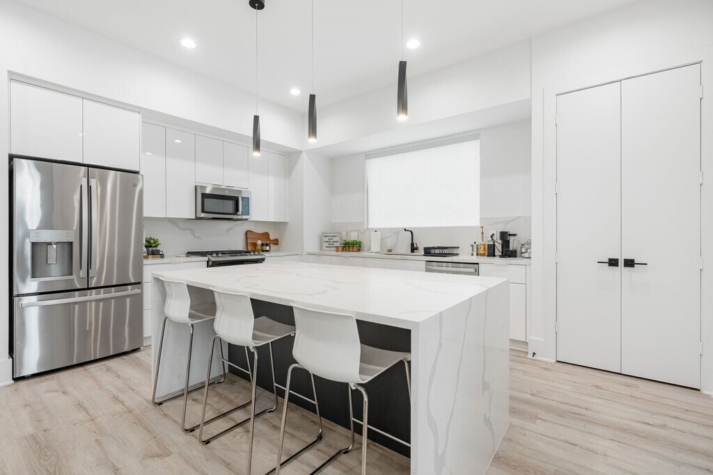 Luxurious modern 3/3.5/2 home with next level finishes & located in East Downtown,minutes from Central Business District,Medical Center,Minute Maid Park,Toyota Center,Discovery Green,IAH,HOU & within walking distance to the new 150-acre East River development. Designed for the modern lifestyle this home showcases an open-concept perfect for entertaining w/the kitchen seamlessly flowing into all the living spaces including a spacious private balcony w/skyline views. Features include a generous Bedroom or study w/ensuite on the first floor,wide-plank luxury vinyl flooring,custom kitchen w/ SS appliances,island,deep sink,wine refrigerator,quartz countertops & euro style cabinetry. The expansive window lined owners suite is complete w/a stunning ensuite bath,dual vanities,freestanding soaking tub,glass shower & massive walk-in closet. Secondary bedrooms are en-suite w/walk-in closets and designer selections. Fully furnished w/Refrigerator,washer and dryer. Move in today! MLS# 78372303