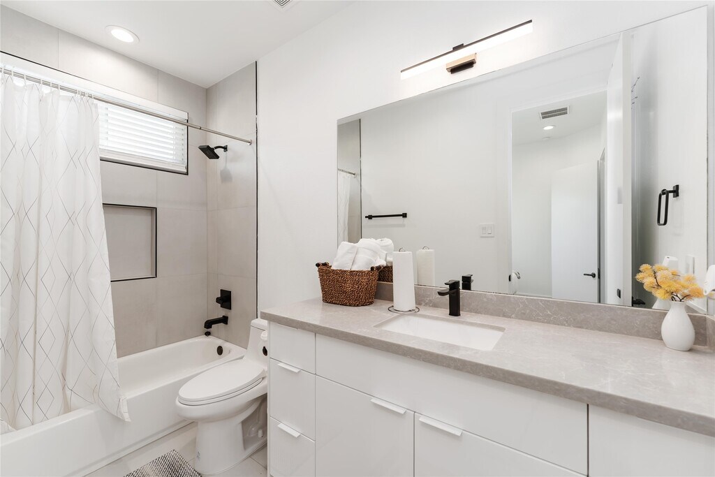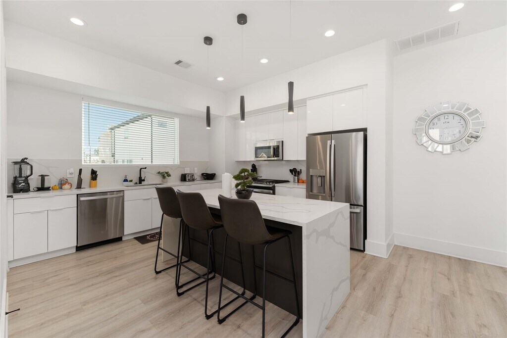 Nestled in a serene gated community,this 3-story contemporary home features 3 bedrooms,3.5 baths,and 10 ft ceilings,flooded with natural light. The chef's kitchen boasts a large quartz island,soft-close drawers,and cabinets. All bedrooms have en-suite bathrooms for convenience. Enjoy easy access to the freeway and nearby Houston downtown attractions. Don't miss the chance to make this tastefully furnished property your new home. Schedule a tour today! *NO CARPET!! MLS# 90114591