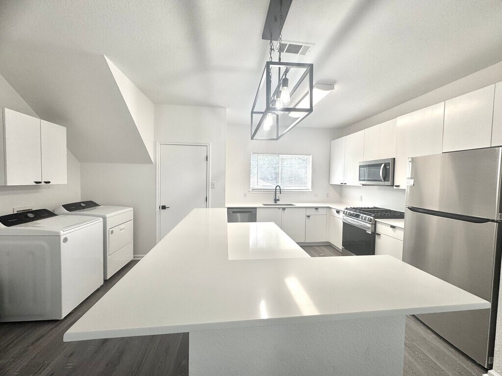 Available for Aug 2028 pre-lease! Large remodeled home ready for move-in! Large bedrooms, great roommate floorplan with Jack N Jill baths (each bedroom has it's own sink / vanity and shared shower / toilet. This is a stand-alone home with off street parking for 6 vehicles underneath. Great location close to campus, easy biking distance and close to UT and Metro shuttles. Washer & Dryer are provided. New flooring, new cabinets, new countertops, new stainless appliances, fresh interior and exterior paint, and modern new light fixtures are just a few of the upgrades in this property. No yard but a huge patio great for outdoor entertaining. Email listing agent for a video tour and more information.