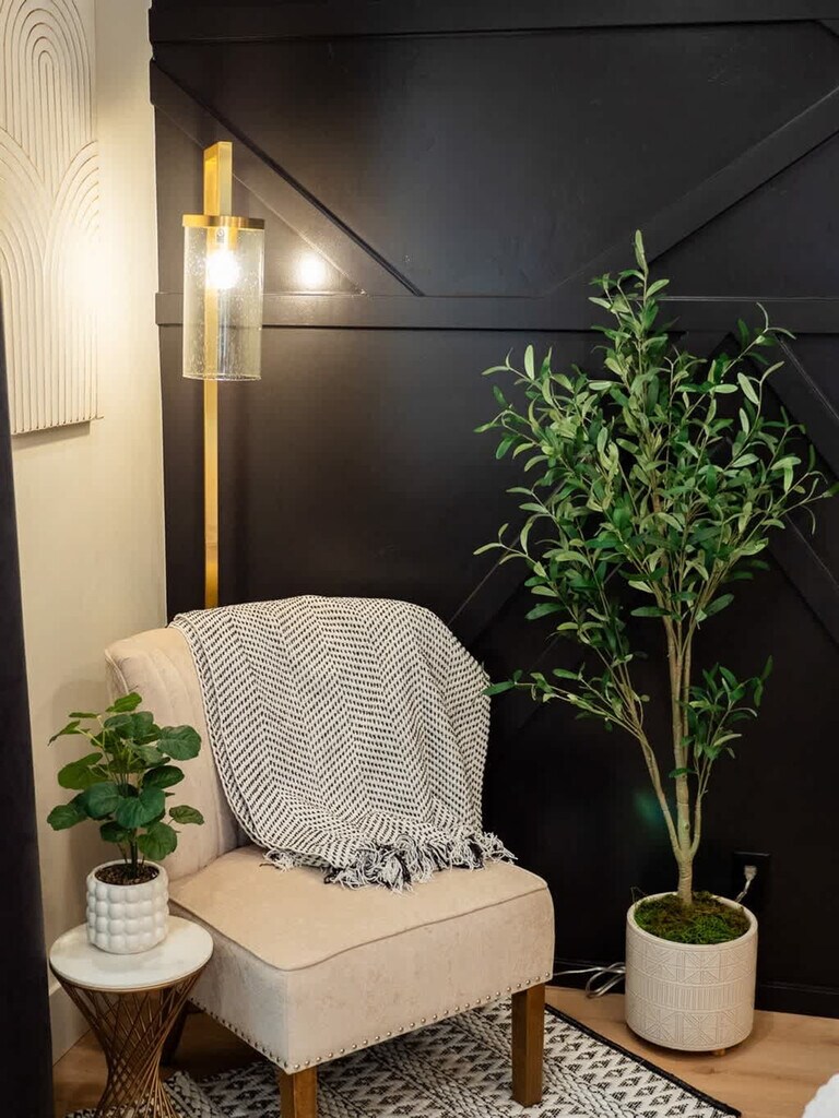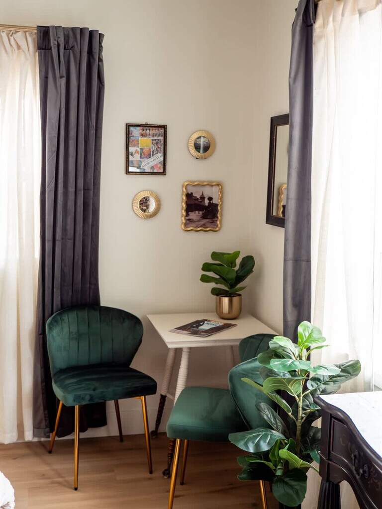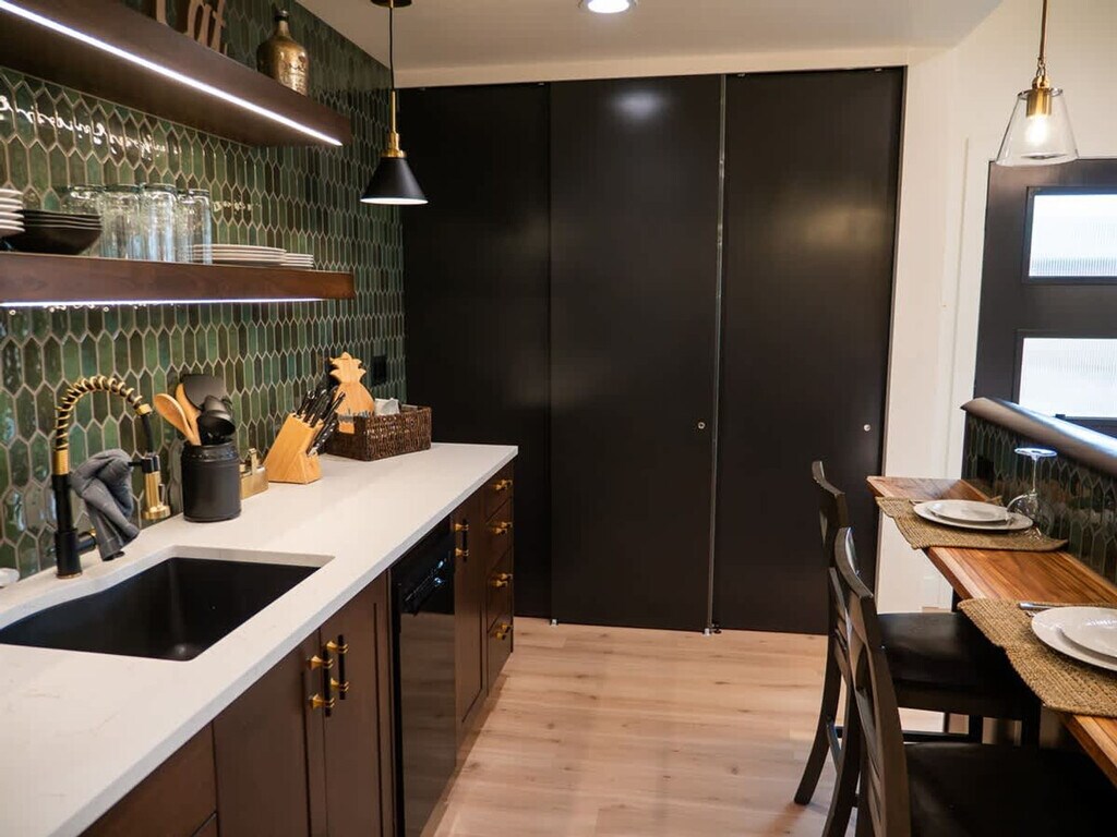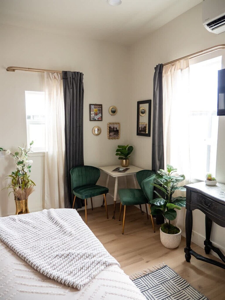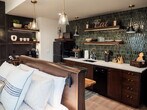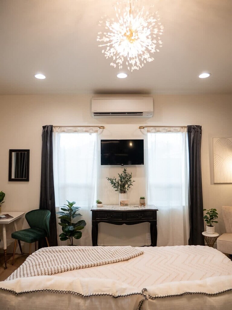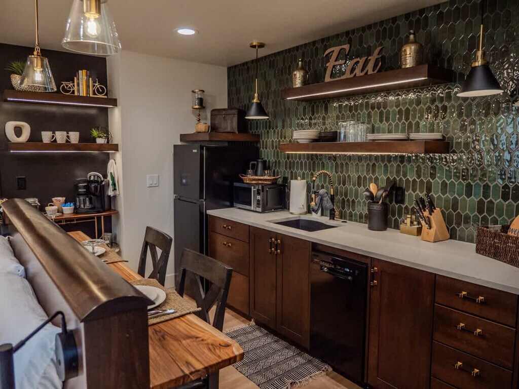 Plan your trip to Boise now in our "Little Sunset" secluded getaway! Feel at home in this private suite tucked away from the road, exuding a James Bond sexy vibe. Custom features in this studio provide a luxurious and comfortable stay after a day full of adventure. The kitchen is adorned with stunning emerald green tiles and includes a sleek dishwasher, a compact hot plate, a sophisticated wine bar, a modern refrigerator, and a full-sized washer and dryer discreetly tucked away inside a closet. The centerpiece of the guest house is the floating king-size bed, an exquisite piece of craftsmanship featuring hand-carved wooden details. The bathroom is a masterpiece of design, featuring a large white tile shower with expansive glass doors, rain shower heads and pristine craftsmanship. Well-behaved pets are allowed with prior approval and a per pet fee of $50 per stay. The home is located in the historic Sunset Avenue neighborhood between 28th and 36th St. in downtown Boise. The guest house is surrounded by lush greenery and a high, elegant fence, offering a secluded sanctuary. Step outside onto the cozy patio, where you can relax under the soft glow of café lights strung beneath a charming canopy. The entire area is privately fenced, ensuring complete seclusion. Parties, events, and unauthorized gatherings are strictly prohibited and violation may result in immediate termination of the reservation without a refund and an additional cleaning or disturbance fee. Smoking (including vaping and cannabis) inside the home will result in a $250 cleaning fee. Only guests included in the reservation are permitted on the property unless approved in advance and additional unregistered guests may incur a $100 per person per night fee. Quiet hours are from 10:00 PM to 8:00 AM and tampering with security devices is strictly prohibited and will result in cancellation without refund. Late check-outs beyond 30 minutes without prior approval will incur a $300 fee. [SI]
