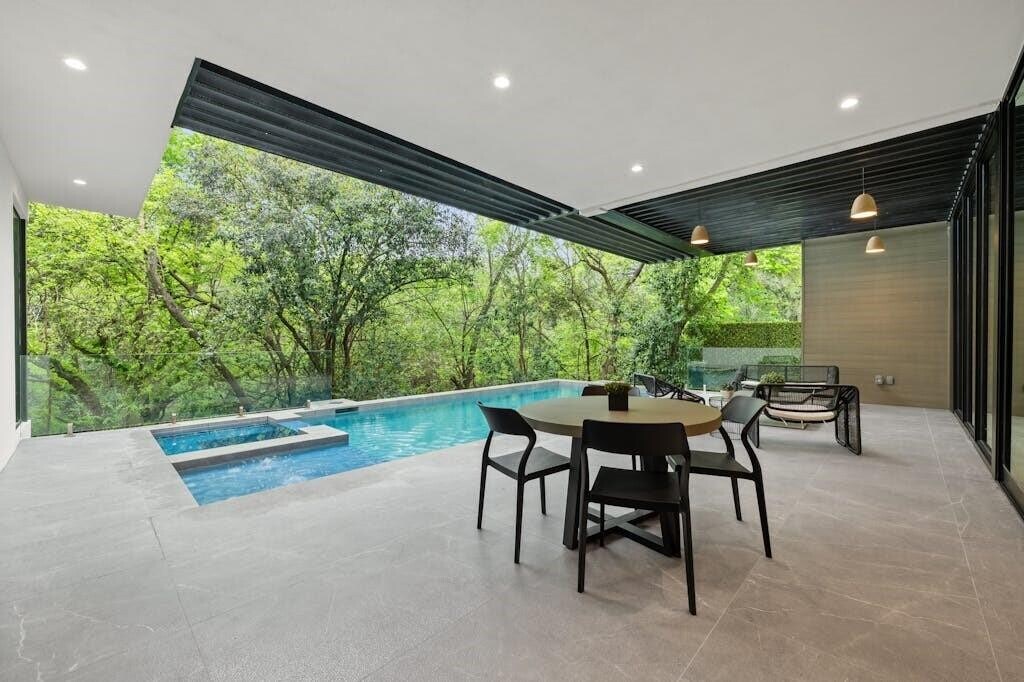 Westlake Luxury Lease — Modern Design Meets Natural Serenity Experience the best of Austin living in this architectural showpiece by Bernardo Pozas, now available for lease. Thoughtfully designed with imported materials, custom carpentry, and an effortless connection to nature, this never-lived-in home combines sleek modern style with everyday comfort — and now offered at an exceptional new rate. Step inside and be greeted by a statement wine cellar that sets the tone for what’s to come. The open-concept living space boasts sky-high ceilings and expansive windows framing the lush Eanes Creek greenbelt, creating a light-filled, treehouse-like atmosphere that feels both elevated and serene. The chef’s kitchen is a true centerpiece — complete with a waterfall-edge island, quartz counters, soft-touch cabinetry, and premium stainless appliances — perfect for entertaining or relaxed evenings at home. Outside, enjoy your own private retreat featuring a fully equipped outdoor kitchen, pool and spa, and breathtaking greenbelt views. Whether it’s morning coffee or sunset gatherings, this backyard delivers resort-style tranquility right at home. The primary suite offers warmth and calm with hardwood floors, oversized windows, and an ensuite bath reminiscent of a high-end spa — complete with floor-to-ceiling marble, a frameless glass shower, soaking tub, and custom walk-in closet. The main floor also includes a refined office, a guest bath ideal for pool days, and a walnut-detailed laundry room. Upstairs, a floating staircase leads to a second living area, three ensuite bedrooms, and an enclosed, climate-controlled terrace adding 740 sq. ft. of bonus space — perfect for movie nights, work, or entertaining. Located in Eanes ISD and minutes from Zilker Park and downtown Austin, this home offers the rare chance to lease a masterpiece where luxury, privacy, and nature meet. Also available for sale. Listing agent is related to the builder/owner.