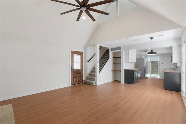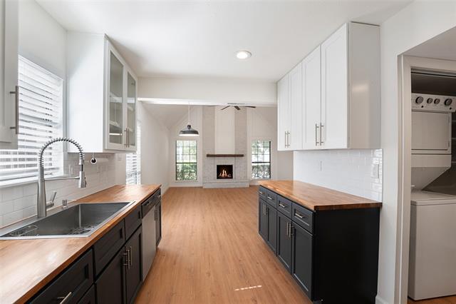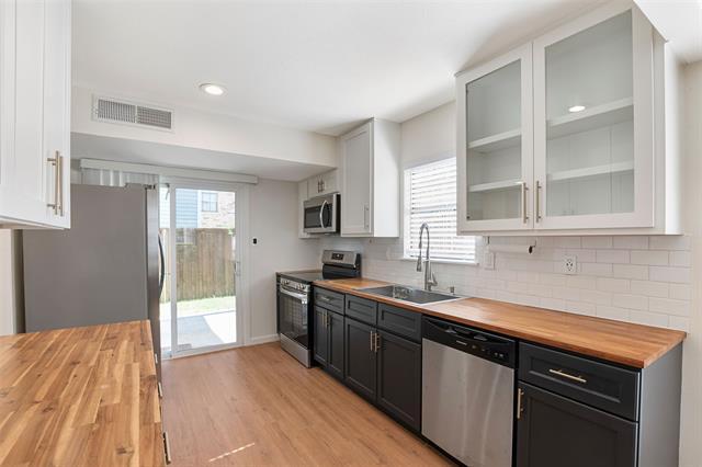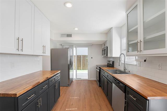 Welcome to this inviting home in the highly desirable Briaroaks neighborhood of Garland, where community pride meets easy access to amenities and a metropolitan feel. Briaroaks is known for its residential charm, well-kept homes and proximity to Garland’s shopping, dining and other conveniences. The neighborhood has strong appeal for those desiring a quiet, yet connected community. Step inside and you’ll appreciate the volume and light: soaring ceilings downstairs open up the space, while an abundance of windows floods the interior with natural light. Living room has an amazing wood burning fireplace with a mantle. The modern, beautifully updated kitchen features recent stainless-steel appliances (refrigerator, smooth top range with convection oven & dishwasher), soft-close cabinetry, butcher block countertops and upper cabinets with elegant glass-front doors and adjustable shelves. A stacked washer & dryer are included for your convenience. Zoned AC units ensure efficient cooling and comfort throughout the home. The primary bedroom features a walk-in closet and skylight, adding to the sense of space and light upstairs. Downstairs you’ll find a clever built-in desk or bar area — a perfect spot to work from home or entertain. Step outside to the small, fully fenced yard with pergola-covered patio — ideal for morning coffee, shaded relaxing, or light entertaining. The HOA maintains the front yard, so you’ll spend your time enjoying, not mowing. Pets are allowed with restrictions, making this an excellent option for you and your furry family members.