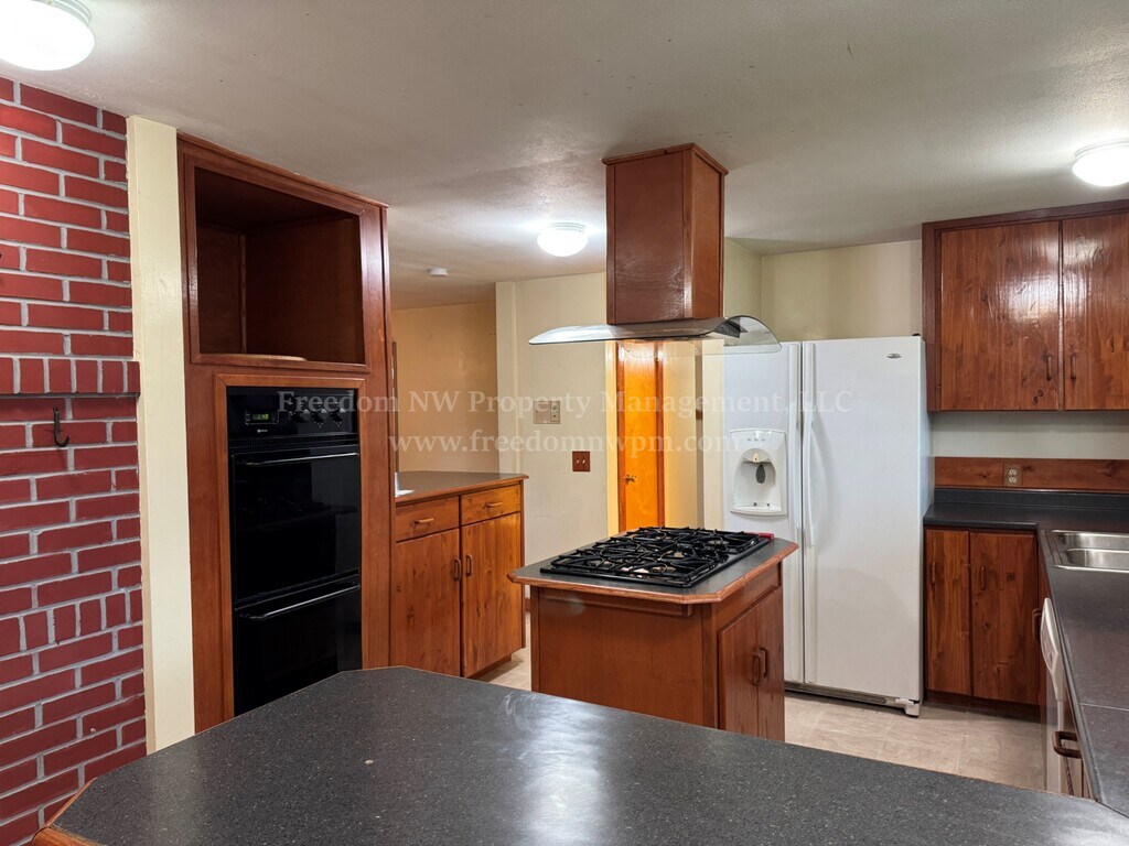 This spacious ranch-style home features four bedrooms, three bathrooms, and plenty of room to spread out. A two-car garage and an extra-large carport offer abundant covered parking. The living room is bright and inviting with large windows and a cozy woodstove. The kitchen includes a gas cooktop, double ovens, refrigerator, dishwasher, and a comfortable eat-in area, along with a separate formal dining room. An unfinished basement with a fireplace provides excellent storage or project space. The home also includes a dedicated laundry room with washer and dryer hook-ups and an office with its own exterior entrance—perfect for working from home or greeting clients privately. Outside, you'll find a large, partially fenced yard with room for garden beds. Located across from Centralia High School, this home offers a convenient in-town location close to shopping, dining, and commuter routes. Pets are negotiable. No smoking.