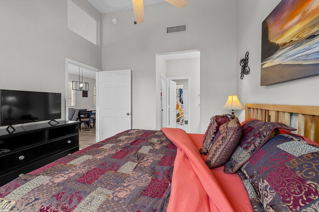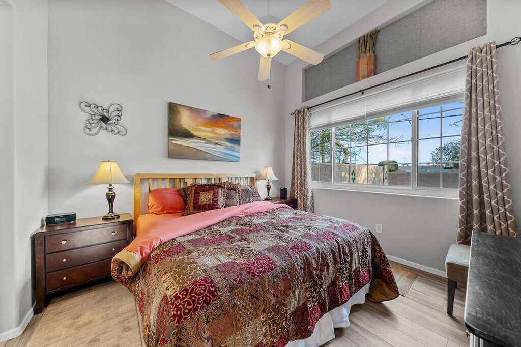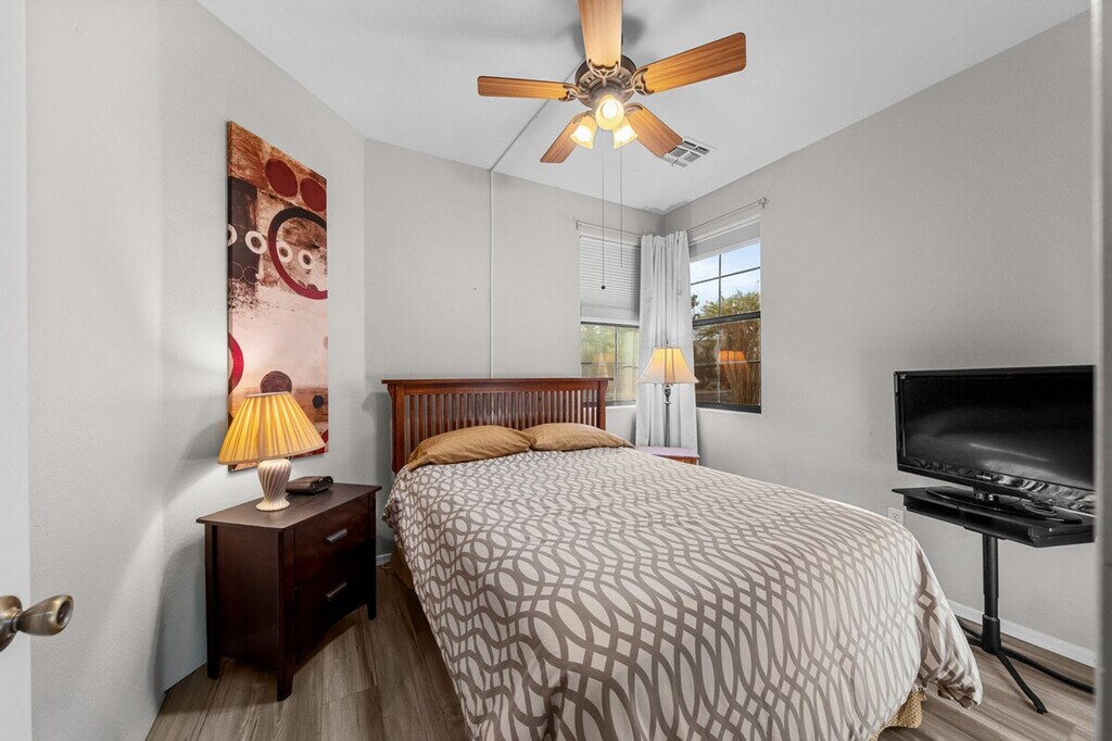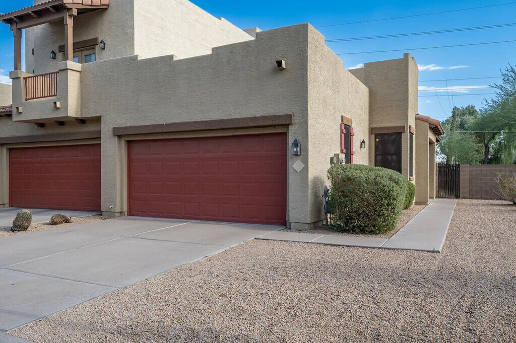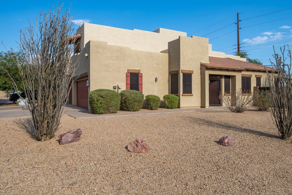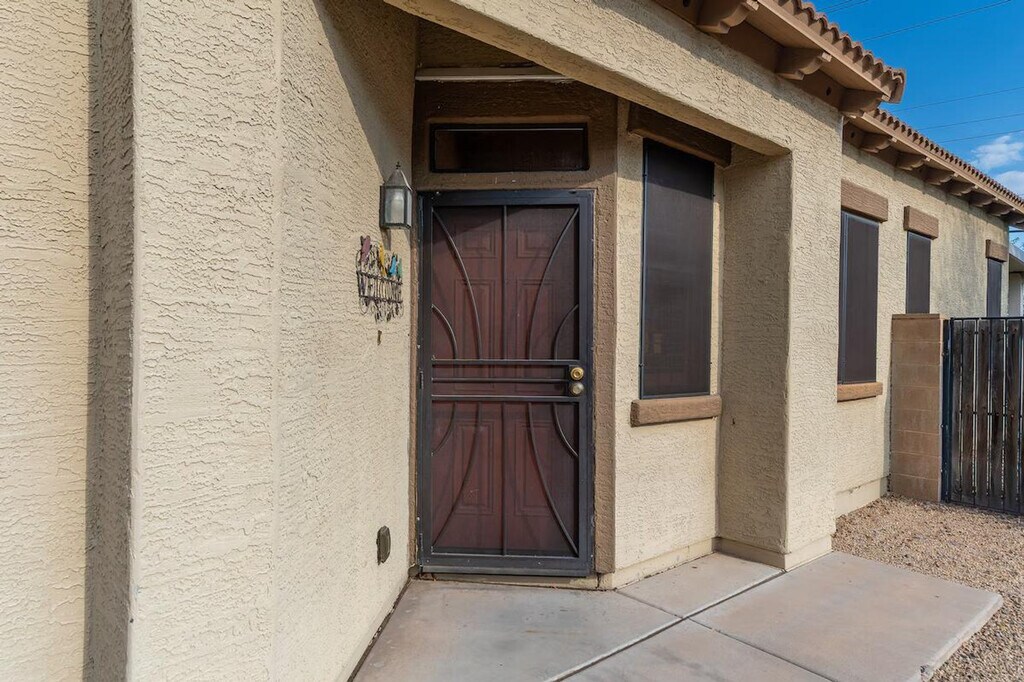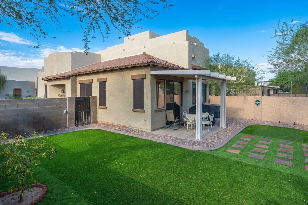 Indulge in the sunshine and feel at home in this 2-bedroom, 2-bathroom Mesa townhome. This townhome offers a fully equipped kitchen, inviting interior, and outdoor entertainment space. The kitchen features a stove/oven, refrigerator, dishwasher, cooking basics, dishware/flatware, coffee maker, blender, Crockpot, ice maker, microwave, toaster oven, water filter, and spices. Enjoy the convenience of free Wi-Fi, central heating and air conditioning, complimentary toiletries, a hair dryer, a washer/dryer, laundry detergent, hangers, and an iron/board. Linens and towels are provided. Enjoy access to the community pool. Parking is available in the garage for 2 vehicles, in the driveway for 2 vehicles, and in visitor parking. Spend your days visiting animals at the Phoenix Zoo, picnicking at Pioneer Park, or exploring the Arizona Boardwalk. Return home to fire up the grill and enjoy a meal outside before taking a dip in the community pool. No smoking, pets, events, parties, or large gatherings are allowed. Additional fees and taxes may apply. A photo ID may be required upon check-in. [SI]