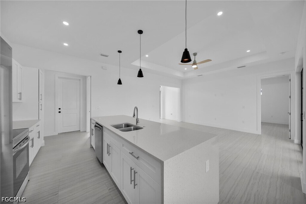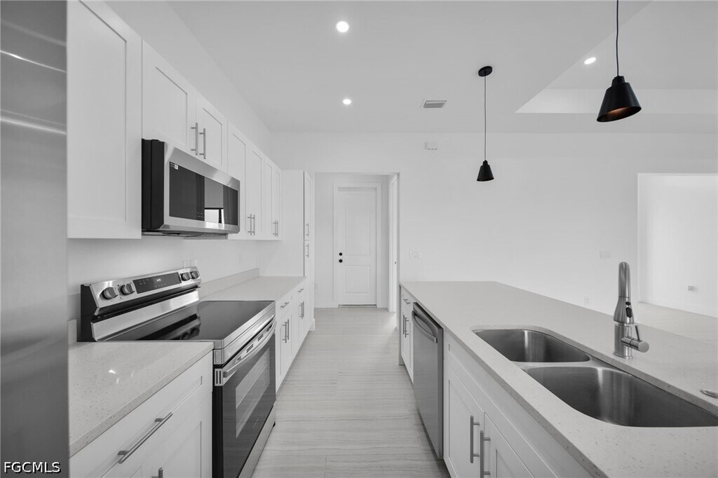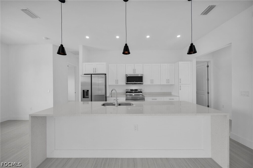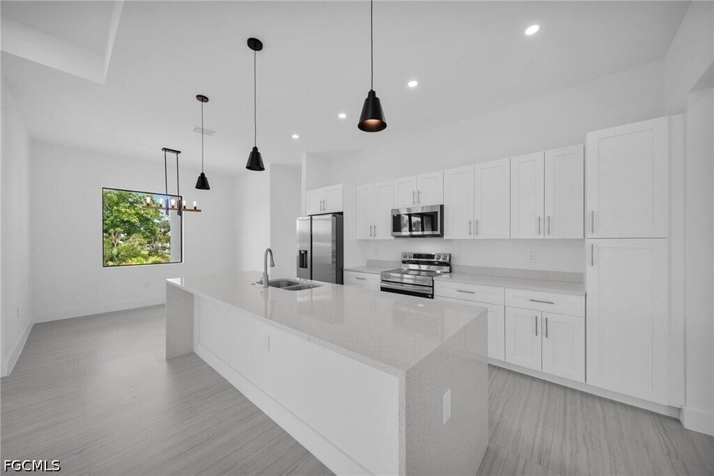 Be the first family to occupy this new construction pool home! With 4 bedrooms and 3 bathrooms,this home is perfect for any size family. Located in the Gator Circle neighborhood of Cape Coral,short driving distance to schools,parks and groceries stores. Modern finishes throughout the home include porcelain tile,quartz,wood shaker cabinets and stainless-steel appliances. The backyard is perfect for entertaining,with a spacious lanai,outdoor bar and sink and pool. This home is ready for immediate occupancy,schedule your private showing today!