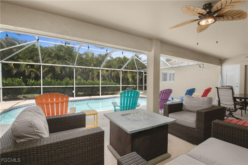 A beautiful open concept design with 4 bedroom,3 full bathrooms. The pool and patio area are exceptionally appointed with an extended lounge area with fire pit,adirondack chairs & patio set. Lanai is accessible off the master suite and kitchen. There is a full screen enclosure surrounding the pool,and one of the bathrooms is accessible to pool area. The lanai features outdoor color lighting all around for great evening entertainment and enjoyment. Triple lot private yard is fenced. Inside is updated throughout w/work/desk area,living room,family room huge island in kitchen. Layout is very open. Kitchen features granite,SS appliances and comes fully equipped. Washer and Dryer inside home. Three car attached garage. Weekly rental is an option