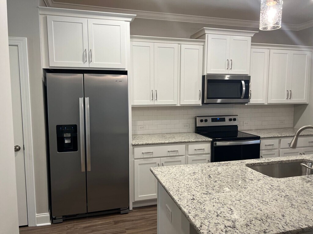 Beautiful, recent construction townhome — Now offering 50% off the first full month’s rent for approved applicants who sign a lease to start by Nov. 1st! This spacious and luxurious townhome features three bedrooms, an office, 2.5 baths, and a one-car garage. Enjoy an abundance of natural light throughout the home! The first floor includes a spacious master suite, a well-appointed kitchen, casual dining area, laundry room, and a powder room. Upstairs, you'll find two additional bedrooms, a full bath, loft area, and a dedicated office space — perfect for working from home. Upgrades include granite countertops, high-end cabinetry, LVP flooring, crown molding, and a screened porch. The front porch has also just been screened-in, offering a private, relaxing space facing the woods. This newer community is conveniently located near dining, shopping, and walking trails. Landscaping is included through the HOA. Dogs under 40 pounds may be considered with an additional pet deposit.