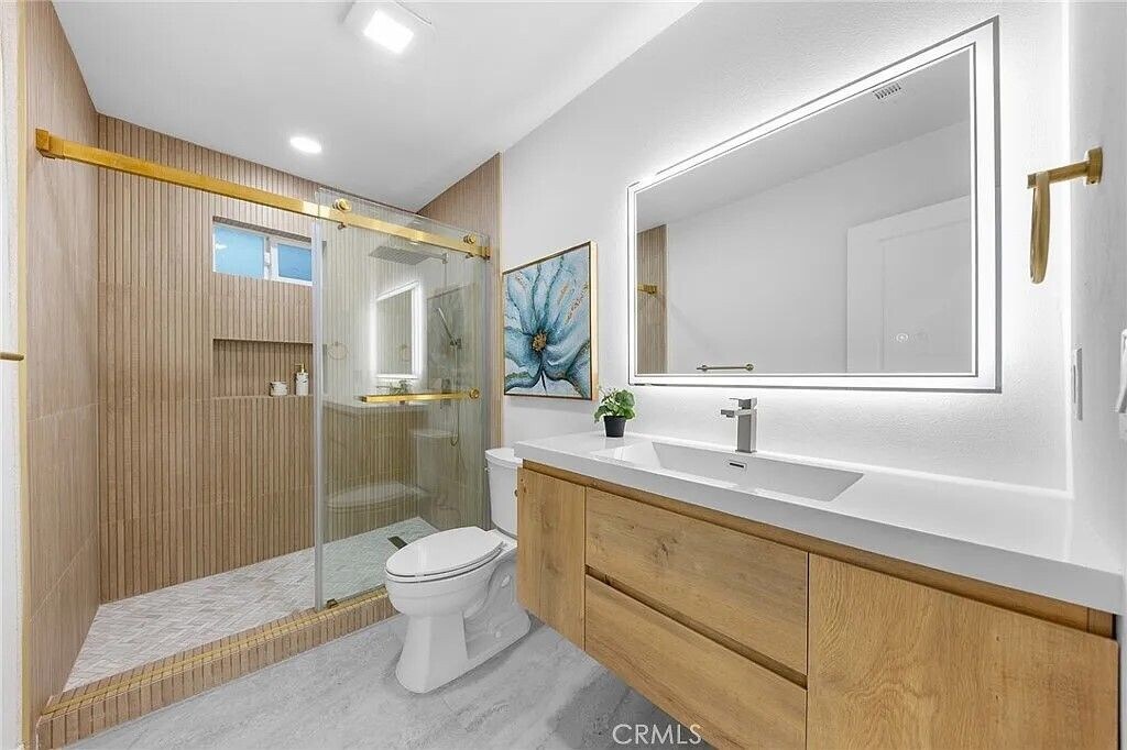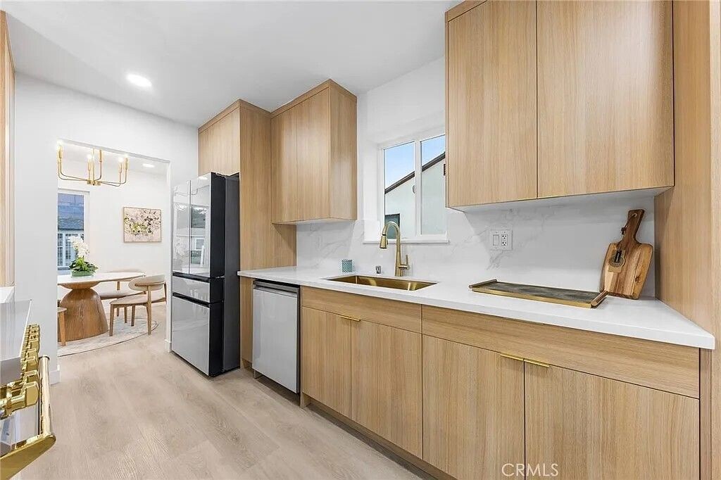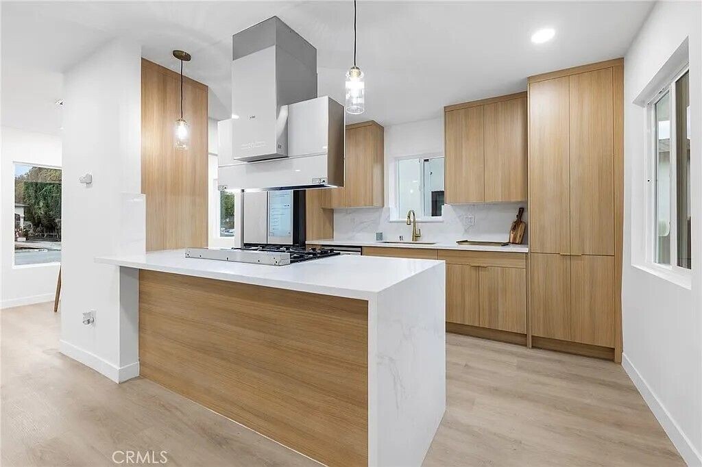 Welcome to this beautifully renovated single-story home in a quiet and desirable Monrovia neighborhood. The bright, open floor plan features new flooring and recessed lighting, creating a seamless flow between the living room, dining area, and remodeled kitchen. The modern kitchen offers quartz countertops, stylish cabinetry, stainless steel appliances, and a spacious peninsula ideal for cooking and entertaining. The home includes four comfortable bedrooms and three updated bathrooms with floating vanities, elegant fixtures, modern tile, and custom glass showers. Situated on a generous lot, the property features a well-maintained front yard, a long private driveway, and a detached two-car garage. The spacious backyard provides plenty of room for entertaining, gardening, or relaxing in the California sunshine. Conveniently located near parks, schools, shopping, dining, and major freeways, this move-in-ready home offers modern comfort and everyday convenience in one of Monrovia’s most charming communities. Furniture shown in photos is for display purposes only.