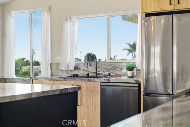 - Fully remodeled upstairs unit of a duplex offering 2 bedrooms and 2 bathrooms with stunning ocean views from the living room, kitchen, and office space just off the kitchen perfect for working from home. The chef s kitchen features an oversized 7 x 6 island, soft-close drawers and cabinetry, natural stained white oak paired with matte black cabinets, and premium appliances including a 6-burner Cosmo gas range, 36 Cosmo gas oven, Samsung dishwasher and refrigerator, and a black stainless-steel sink. The open living area is anchored by a 65 electric fireplace, designer wall colors, dimmers on all ceiling lights, USB/USC outlets, and wall-mounted TVs in every room (included). Laminate flooring throughout with 5½ baseboards add a modern, cohesive feel. Double-pane windows in the kitchen, living room, and office enhance comfort and efficiency. Spa-inspired bathrooms include a deep soaking tub with extra-tall glass doors, defogging mirror with three-mode lighting, handheld and rain shower heads, heated towel bars, smart toilet, and Bluetooth exhaust fan. The primary suite offers two large closets, ceiling fan, and an ensuite bathroom with a walk-in shower featuring a built-in seat, rain shower head, six body sprays, and heated towel rack. Enjoy outdoor living with a large private balcony plus a shared front deck. Additional features include one-car garage and driveway parking. A rare opportunity to rent a beautifully upgraded unit with high-end finishes and ocean views. Listing provided by: Foley, Bonnie of First Team Real Estate LA State License 01008773 Listing posted by Orange County [SYNDID 4150610 01252026]
