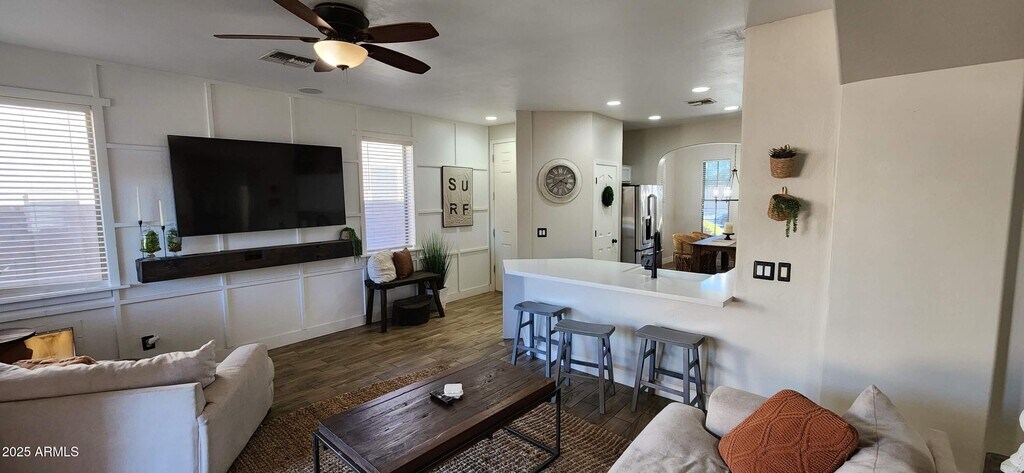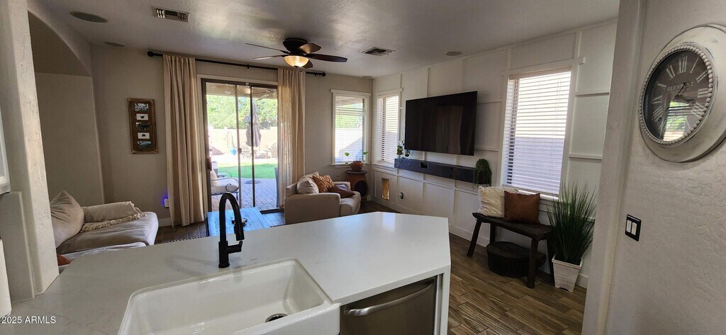 No Application Fees! Beautiful 2 bedroom plus den,2 bathroom single-level Gilbert home located in the desirable Seville community. This open-concept home offers numerous upgrades including wood plank style tile flooring throughout with no carpeting,two-tone neutral paint,two-inch wood blinds,upgraded fixtures,and abundant natural light. The spacious living room opens to the upgraded kitchen featuring quartz countertops,farmhouse sink,breakfast bar,separate pantry,stainless steel appliances,and a large dining area. The primary suite includes a walk-in closet and private bathroom with modern finishes. Washing machine and dryer are included. The backyard features a covered patio,extended paver patio,built-in fire pit,grass area,and no neighbor to the rear,offering excellent privacy. Located in the prestigious Seville community with nearby access to parks,walking trails,and the Seville Golf and Country Club. Conveniently close to Chandler Heights Road and Higley Road,this home provides easy access to the Loop 202 freeway,shopping,dining,and top-rated Gilbert schools. All Denali Real Estate residents are automatically enrolled in the Resident Benefits Package (RBP) for $55.00/month which includes Renter's Liability Insurance,Credit Building to help boost the resident's credit scores with timely rent payments,up to $1M Identity Theft Protection,HVAC air filter delivery (for applicable properties),our best-in-class resident rewards program,and much more!