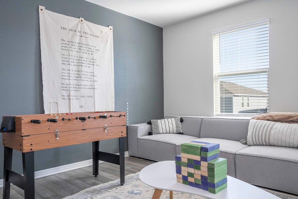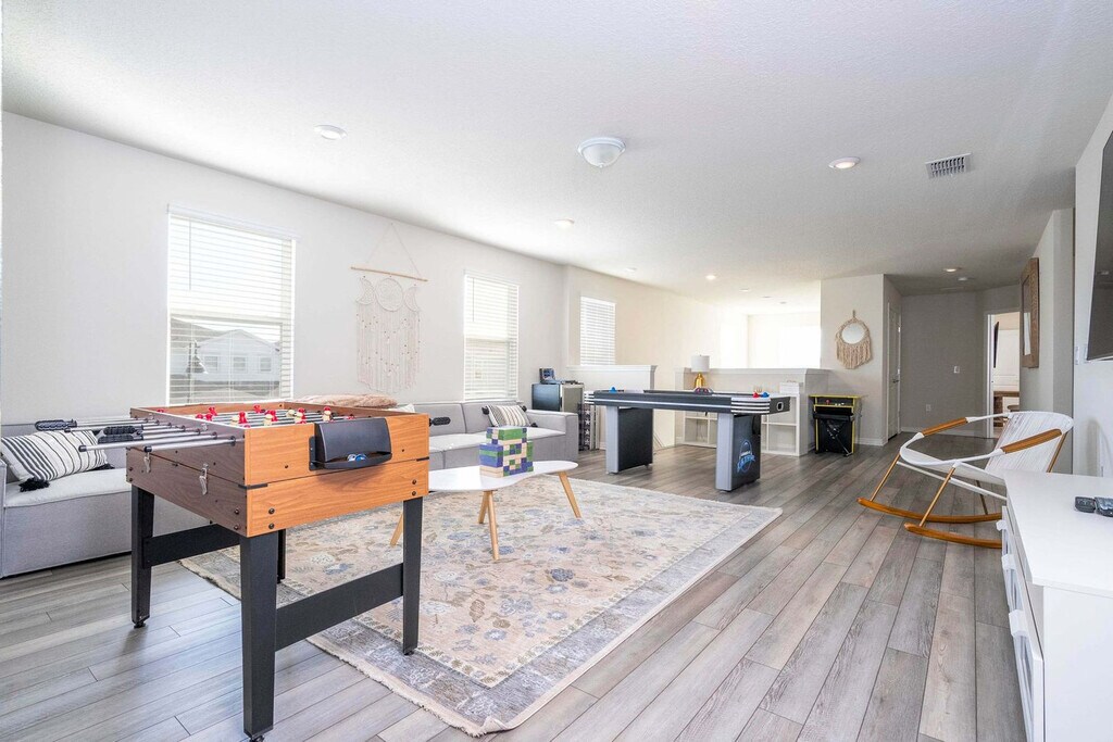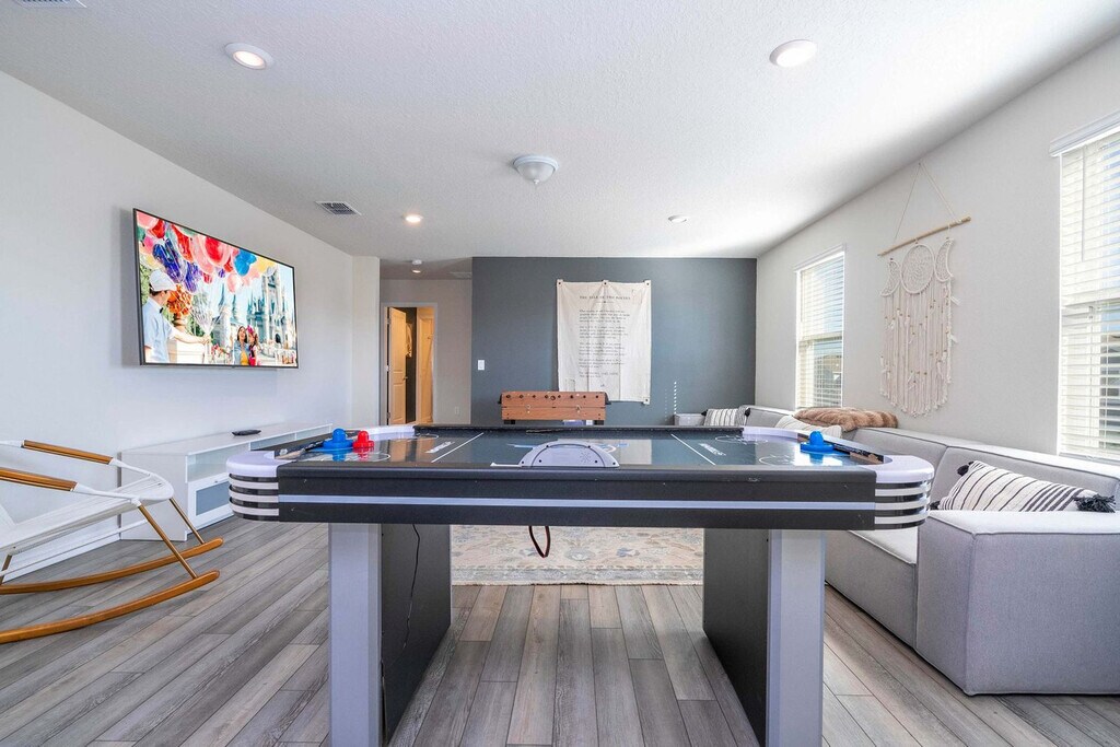 Relish an unforgettable Floridian getaway and feel at home in this spacious 6-bedroom villa in Davenport, just minutes from Disney World. This villa can accommodate up to 15 guests, making it perfect for large groups, families, and Disney enthusiasts. This lavish villa features spacious bedrooms with plush bedding, flat-screen TVs, and central air conditioning. Enjoy a private screened pool and spa. The modern kitchen is equipped with stainless-steel appliances and stocked with essentials. For entertainment, there is a fully equipped garage movie theater with a large 120” screen and cozy recliners, as well as a loft area packed with games and lounging space. There are five full bathrooms. Free parking is available on the premises on a first-come, first-served basis. Pool and spa heat is available for $45 per day and takes 24 hours to fully reach the desired temperature of up to 90 degrees Fahrenheit for the pool and 104 degrees Fahrenheit for the spa. Located in Windsor Island Resort, one of Orlando’s newest luxury communities, this villa is minutes from Disney, 23 minutes from SeaWorld, 32 minutes from Universal, 18 minutes from the Convention Center, and 40 minutes from Legoland. The resort features world-class amenities, a resort-style pool, lazy river, and family fun. Popular attractions like Disney's Animal Kingdom Theme Park, Magic Kingdom Park, Disney’s Hollywood Studios, Walt Disney World Resort, and Epcot are less than a 15-minute drive away. Nearby restaurants include The Ravello, La Luce, and The Steak, and local bars and lounges are also close by. Self-check-in is available with a smart lock. Dedicated workspace areas are available. [SI]