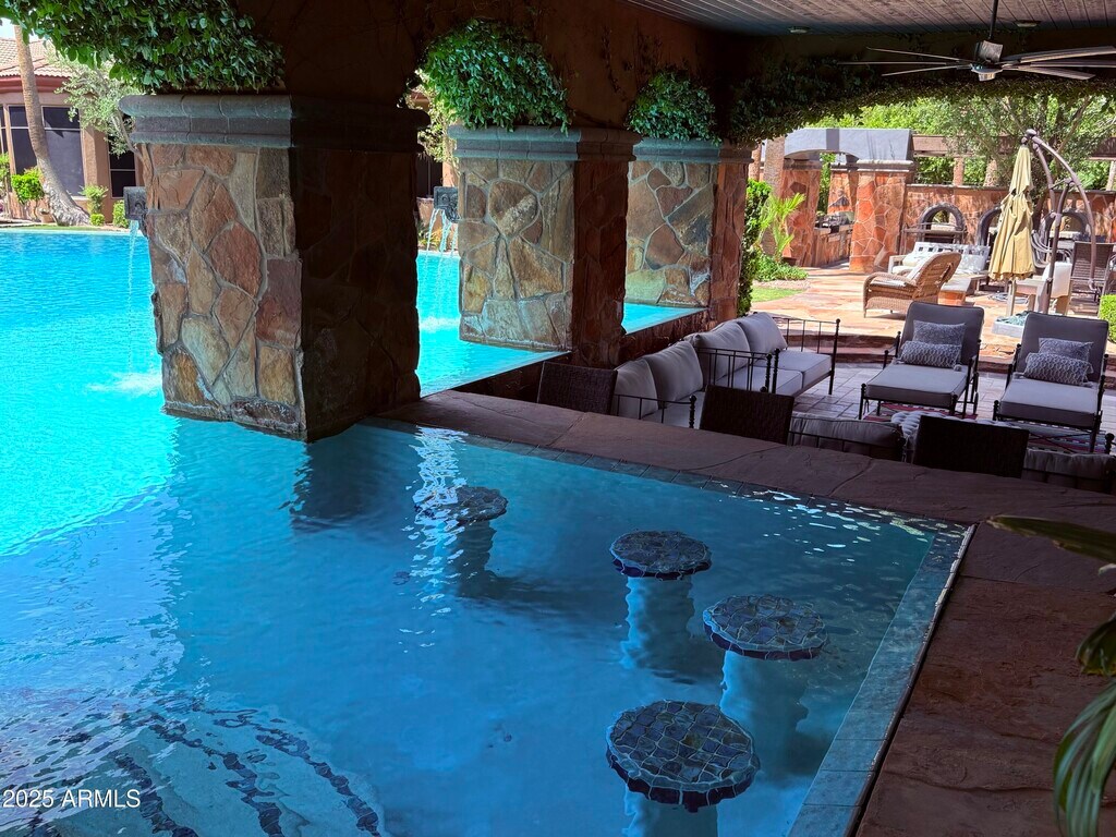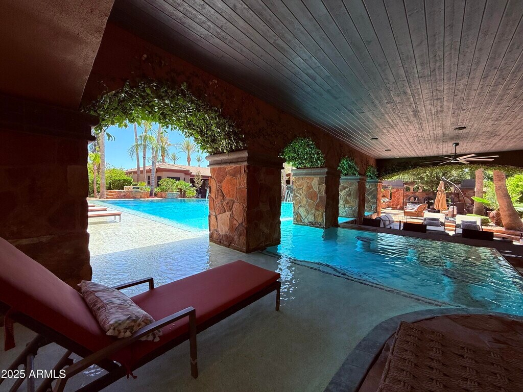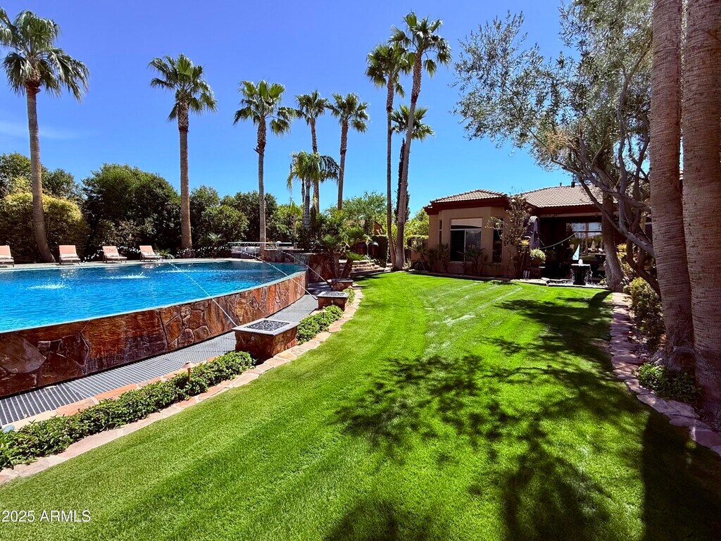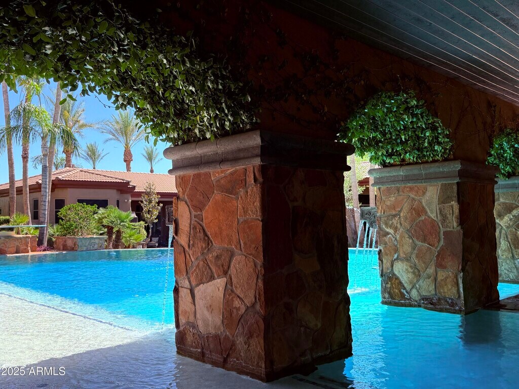 Epic Modern Tuscan estate on nearly an acre lot w/in the citrus-lined streets of gated,Arboleda. Near the 202/Red Mtn fwy,Falcon Field Airport,Gene Autry tennis park,& several golf courses,& a short drive to Spring Training,Scottsdale/Old Town/PV & SkyHarbor. Outdoor entertainer's delight- lush lawns,Italy-inspired courtyard fountains,a 126,000gal,14-foot deep neg edge diving pool w/Baja shelf,swim-up/ 8 person bar,lg Ramada; Cantera stone gas fireplace,fridge & TV/sound bar. Huge outdoor kitchen w/BBQ,pizza oven,TV. Single-story home w/basement,custom theater rm for 12/fully wired entertainment ctr connecting the entire house. Exquisitely upgraded kitchen w/island,granite,New Viking appliances,bread warmer,6 burner gas stove Split plan; prim suite retreat. Add'l space Living,Dining,Great room,sitting room,Bonus space/office,basement entertainment space,bar,and theater. Smart home controlled from phone and home. Indoor,outdoor,and garage speakers. Full Custom Garage "Man Cave" remodel just finished! Designer walls,TV,speakers,Lift,Ceiling,Lighting,epoxy floor,and sink. New paint- in,out,and fencing. New sun shades on entire home. Custom interior paint,wainscotting and coffered ceiling. New LVP flooring and flagstone sealing. Remodeled baths: counters,showers,toilets,wallpaper,fixtures and plumbing. Huge Koi pond and multiple fountains. Landscaping front/ back,pool cleaning,and Koi/ Koi pond care included in monthly rate. All furnishings- including Restoration Hardware and Bernhardt throughout available as a furnished rental option.. Rates,terms and furnishings can vary- Ask for details. Will consider a 6,12 or 24-month lease,or longer. Monthly rental incentives for prepaid rent. May consider fully furnished at a negotiated monthly rate. Possibly for Sale; as well as Lease/Purchase,Lease Option,or Seller Financing at 5.1%. Ask for details.