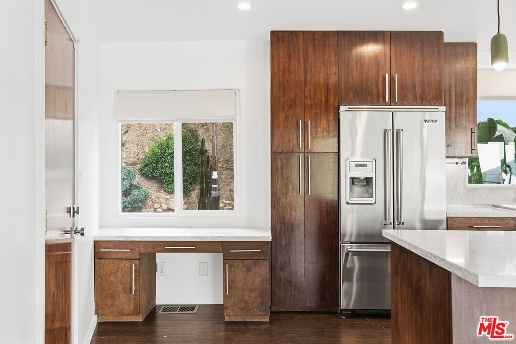 High above the city, tucked into the folds of the Hollywood Hills, 3476 Troy feels cinematic in the best possible way, dramatic, light-filled, and impossibly cool. From the moment you walk in, the vaulted wood-beamed ceilings steal the scene. Warm planks stretch overhead, drawing your eye toward walls of glass that open to an expansive balcony with sweeping green hillside views. It's the kind of living room that makes you want to host a wine night, write a screenplay, or simply sit back and watch the light shift across the canyon. Golden hour here deserves its own score. The open kitchen plays its part beautifully, with rich wood cabinetry, stone countertops, stainless steel appliances, and a generous island that anchors the space. It's equal parts functional and refined, ready for everything from morning espresso to late-night dinner parties that linger long after the credits would normally roll. Three spacious bedrooms offer flexibility for guests, creative space, or a proper home office with a view. The primary suite opens directly to the balcony, inviting in fresh canyon air and soft morning light. The bathrooms are clean and classic, including a spa-worthy shower clad in natural stone that feels both grounded and quietly luxe. An attached private garage adds convenience and extra storage, complete with a washer and dryer tucked inside for easy everyday living. Step outside and you'll find a long, private balcony stretching the length of the home, string lights overhead, a patio heater for cool evenings, and rolling hills that remind you why the Hollywood Hills remain so iconic. And yes, for film lovers, you're just moments from Universal Studios and the legendary house used in Alfred Hitchcock's Psycho. A piece of cinematic history tucked into the neighborhood, dramatic on screen, but here the only suspense is whether you'll snag this lease before someone else does. Elevated, design-forward, and undeniably vibey, this home is ready for its close-up. MLS# 26653547
