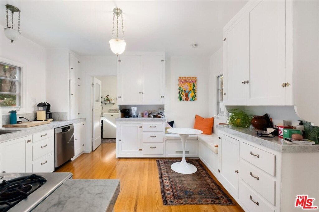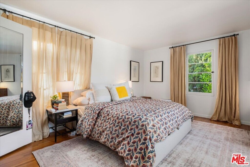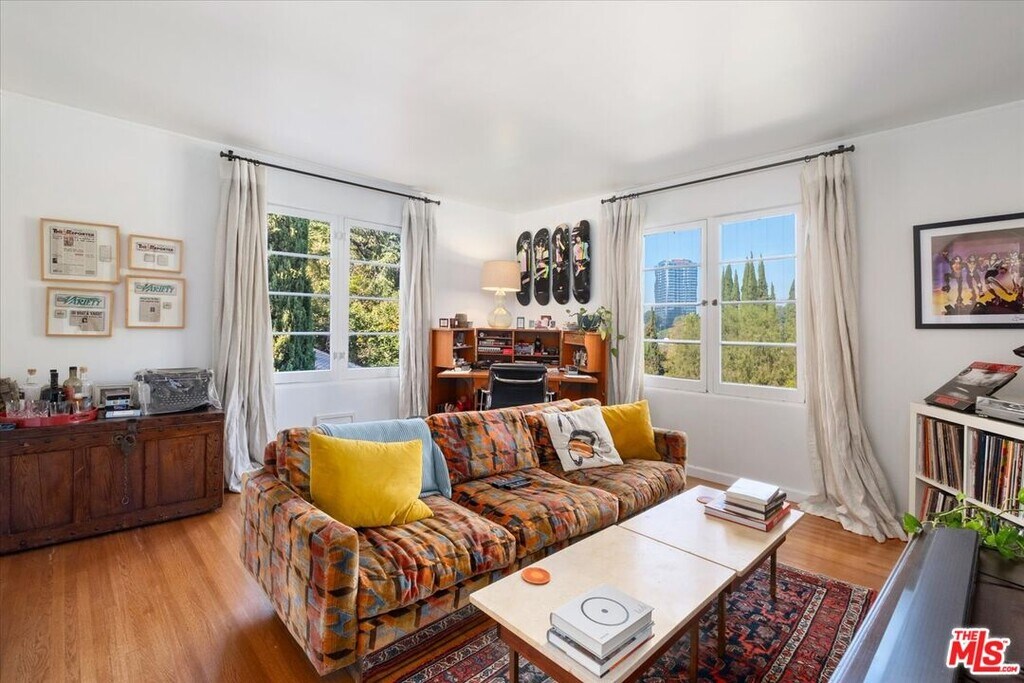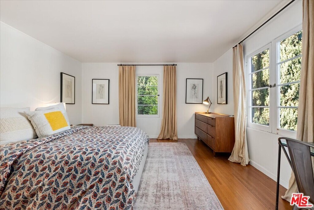 Nestled in the Hollywood Hills just south of Cahuenga Blvd, this Normandy-inspired home exudes the timeless glamour of Golden Age Hollywood. Inside, signature architectural details meet a thoughtful floor plan designed for both intimate evenings and grand entertaining. The inviting living room, anchored by a classic fireplace, flows effortlessly into a step-down formal dining room and an adjacent butler's pantry. For those who love the California lifestyle, a spacious patio off the dining room offers a seamless indoor-outdoor transition for al fresco meals. The kitchen is a blend of charm and utility, featuring a farmhouse sink, cozy banquet seating, and ample cabinetry. Upstairs, two serene bedrooms overlook the lush, tree-lined vistas of Universal City, while a sun-drenched office/studio boasts renovated flooring. Character details abound, from original hardwood floors to vintage light fixtures. The tranquil backyard serves as a private sanctuary with multiple patio areas and two storage units. There is additional storage in the garage along with an EV charger. Ideally located minutes from major studios, Universal CityWalk, Hollywood and the vibrant shopping districts of Studio City and NoHo. MLS# 26633457