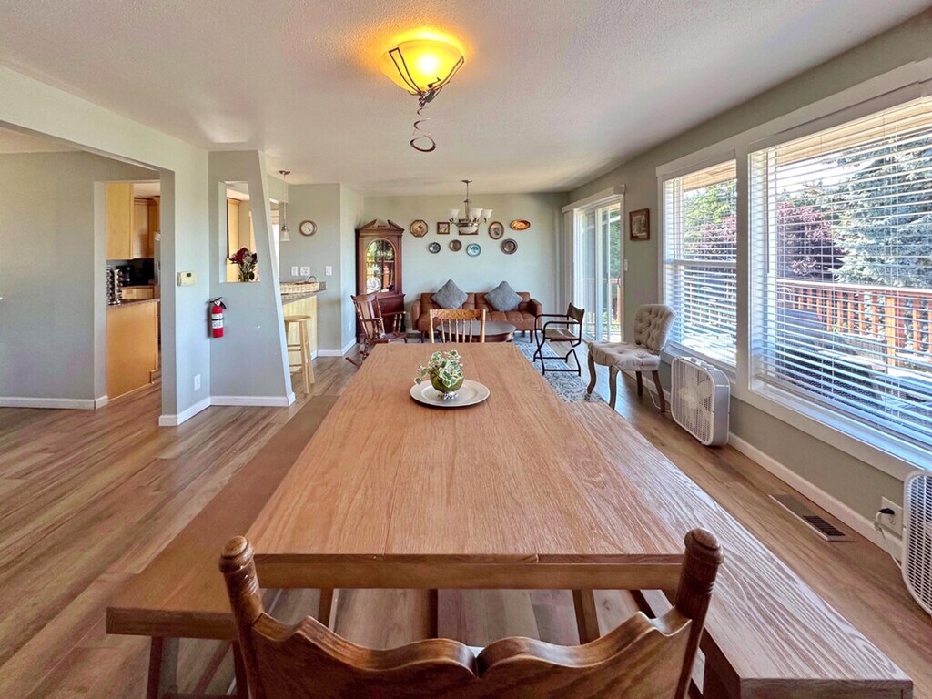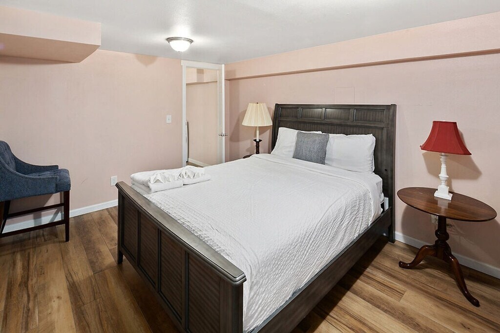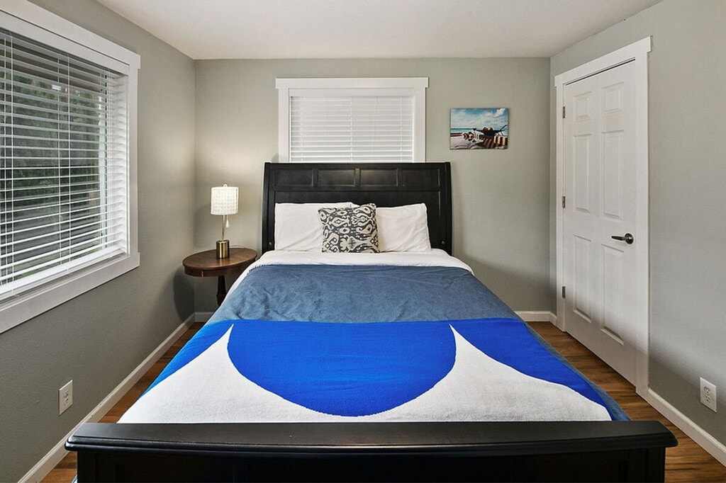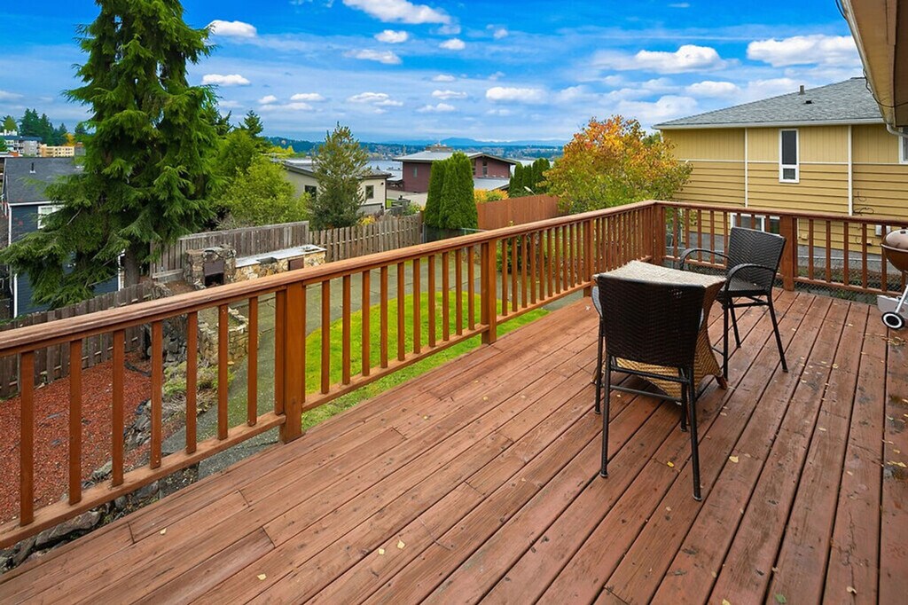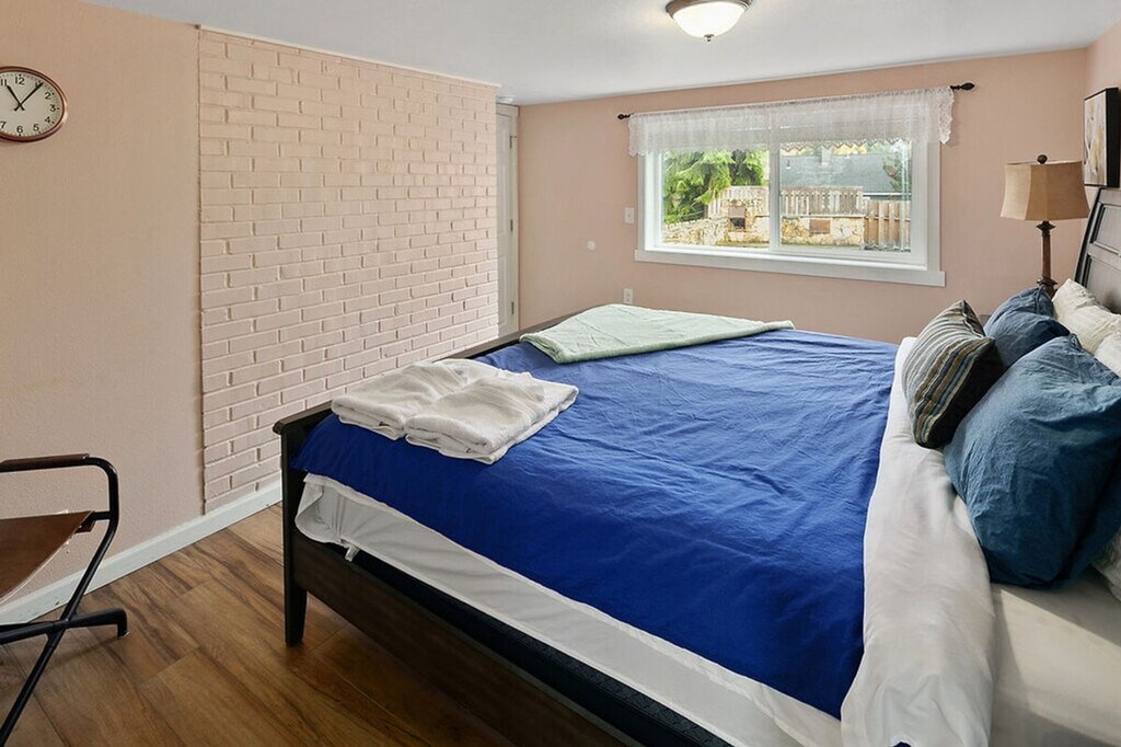 Feel at home in this cozy, pet-friendly home in Lake Forest Park, offering stunning views of Lake Washington and the mountains. Conveniently located on a quiet street, this 4-bedroom, 3-bathroom home spans 2100 sqft and accommodates up to 8 guests. With just one step to entry, the home features a first floor with a living room, dining room, kitchen, two bedrooms (one with a king-size bed and another with a queen-size bed), and a bathroom. The lower floor, a walk-out basement, includes a primary bedroom with a king-size bed and ensuite bathroom, a bedroom with a queen-size bed and ensuite bathroom, a laundry room, and a sitting area with backyard views and a piano. This home boasts a living room equipped with a Smart TV, pre-signed into Netflix and Disney Plus for your entertainment. The large upper floor balcony offers breathtaking views of Lake Washington and the mountains. The kitchen is fully stocked with a stove, cookware, silverware, toaster, Keurig coffee and tea maker, air fryer, slow cooker, and more. Each of the four bedrooms is outfitted with high-quality mattresses, linens, and comfortable duvets. An onsite washer and dryer cater to your laundry needs, and the large, fully-fenced backyard is perfect for pets. Ample parking is available for your convenience. Well-trained pets are welcome with a fee of $50 per pet per night. Please inform us if you’ll be bringing your pet and how many, as the pet fee beyond one pet is processed manually post-reservation confirmation. Lake Forest Park is a charming suburban neighborhood with quaint shops and a variety of dining options, located just about 20 minutes from Seattle city center. The best way to explore this area is by car, allowing you to easily access nearby attractions and amenities. The detached garage is not part of the rental, but there is plenty of parking available. The fireplaces on both levels are not available for guest use. This home strictly prohibits parties and events, and enforces quiet hours between 10pm and 8am. Smoking or vaping of any kind is not allowed anywhere on the property, including outdoor areas. A $500 fine applies per violation. Use of the fire pit and charcoal grill is prohibited during the burn ban. Guest access is provided via a smart lock. [SI]