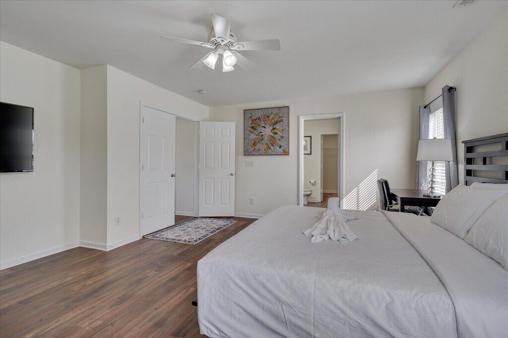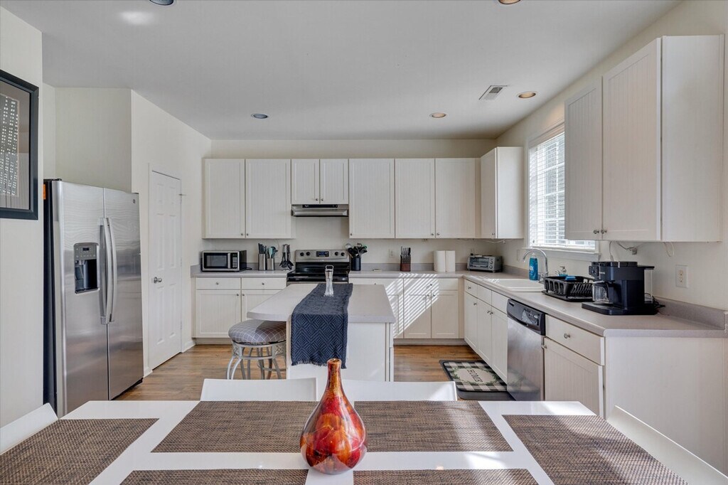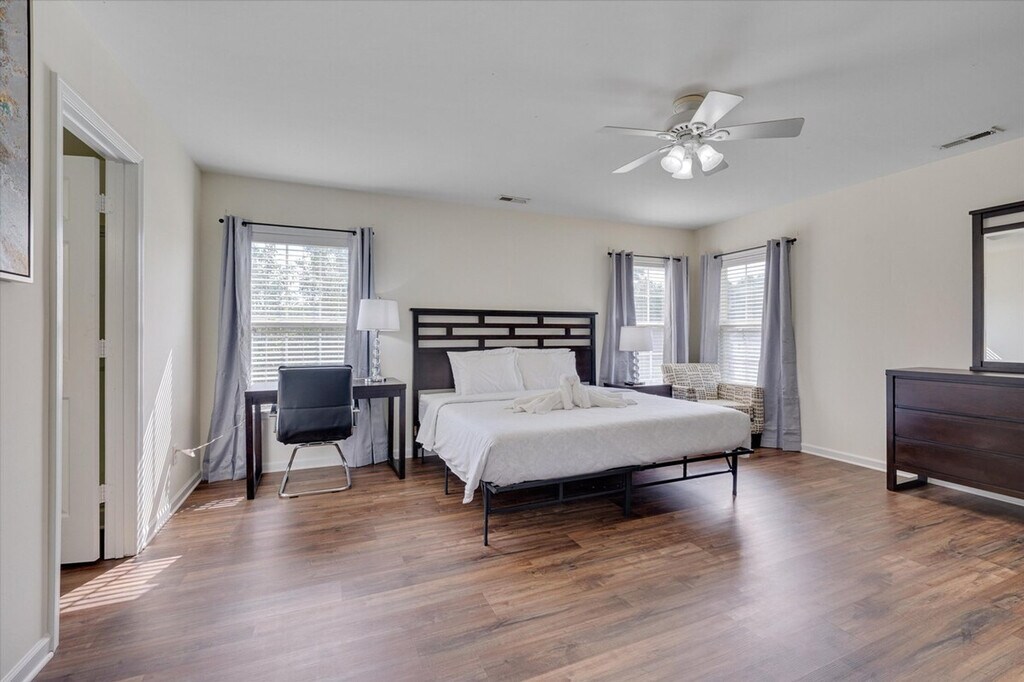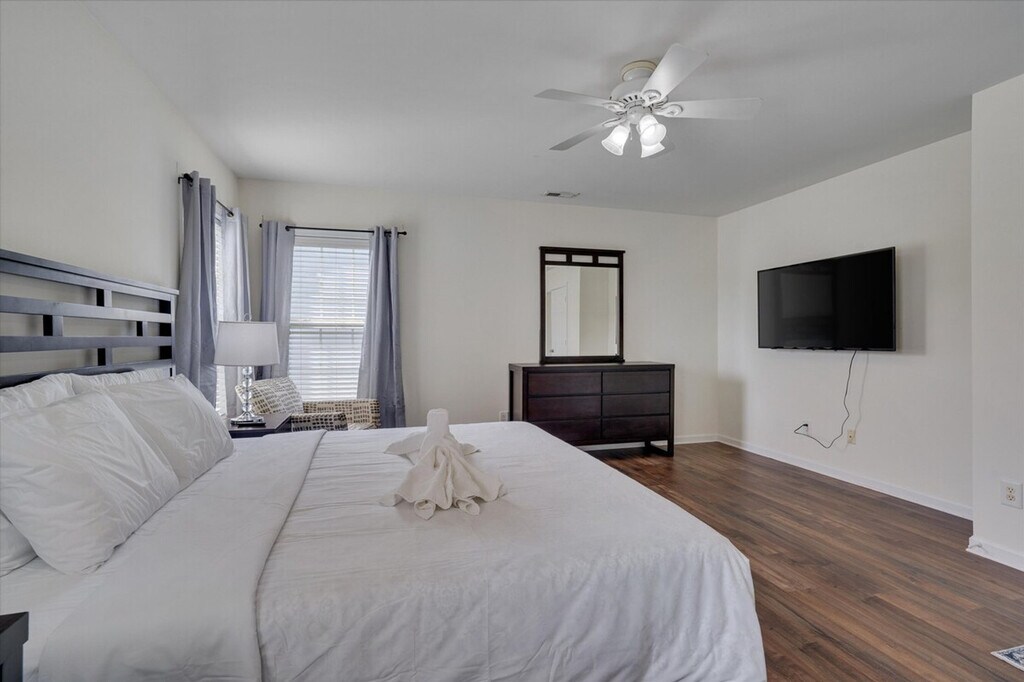 Welcome to The Mac Daddy, a stylish 3-bedroom home in Southeast Raleigh. Feel at home in this spacious retreat featuring high ceilings and an open living area. This home features a modern kitchen with an island counter. For entertainment, Samsung smartTVs are available in most units, with 100+ channels of TV Plus along with your popular streaming services. High-quality sheets made of 100% organic cotton cooling percale weave and soft breathable bed sheets and pillow cases are provided. Fiber optic internet is always available where available with Ethernet hand-offs for a direct, private connection up to 3GB, faster than Wi-Fi. If you need additional Ethernet ports, an ethernet switch can be provided free of charge. Dogs and cats are welcome. Perfect for families, groups, or business travelers seeking comfort and convenience, this home is located near Wakemed Raleigh Campus (6mi), Downtown Raleigh (7mi), NCSU (11mi), PNC Arena (16mi), Koka Booth Amphitheatre (20mi), NC State Fairgrounds (17mi), and Coastal Credit Union Music Park (4.5mi). Self check-in is always available. A door code will be provided about an hour before check-in on check-in day. The door locks are mechanical and do not rely on electricity nor the internet to work. [SI]