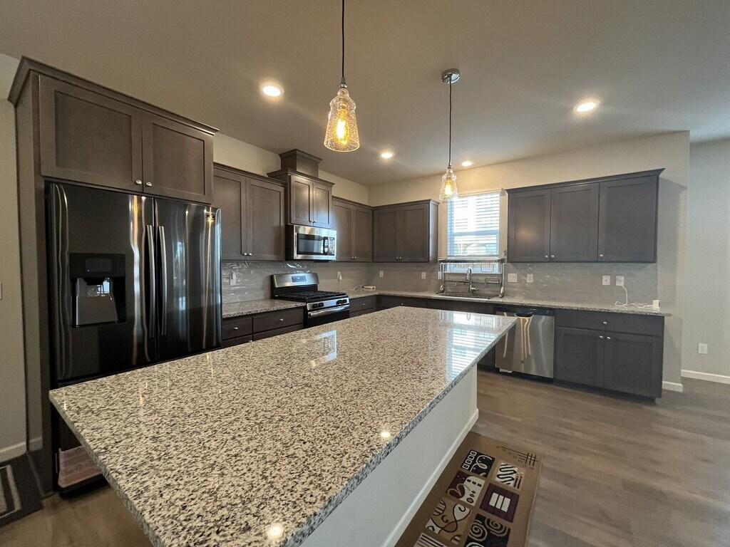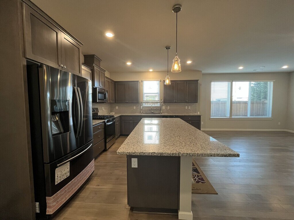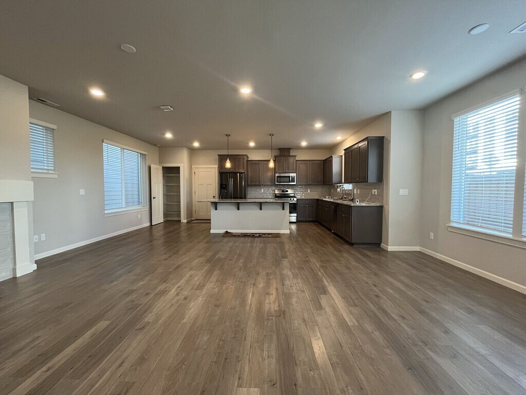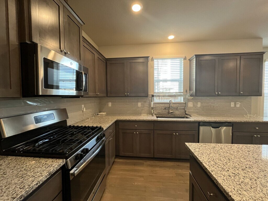 This beautifully maintained three-bedroom, two-and-a-half-bathroom home offers 1,853 square feet of thoughtfully designed living space and sits on a desirable corner lot. The exterior features a charming front lawn framed by small bushes and shrubs, along with a covered front patio that wraps around the side of the home, creating a welcoming and functional outdoor space. Built in 2019 and conveniently located near a newer shopping center, this home blends modern design with everyday convenience. Inside, the bright and open entryway showcases hardwood flooring throughout the main level and includes a dedicated cutout ideal for a console table, shoe rack, or drop zone. The entry also hosts a half bathroom and a staircase that leads to the upper level. The main living area features an open-concept layout that seamlessly connects the living room, dining room, kitchen, and breakfast nook. The kitchen is spacious and modern, centered around a large island that comfortably seats four. It is equipped with stainless steel appliances including a French-door refrigerator, gas stovetop and oven, mounted microwave, dishwasher, and a deep stainless steel sink positioned beneath a window. Dark wood cabinetry lines the kitchen, complemented by a gray subway tile backsplash and generous countertop space. A pantry and large window sit just off the kitchen, creating an ideal spot for a breakfast nook or study desk. The living room is anchored by a gas fireplace that serves as a focal point for the space. On either side of the fireplace are built-in cutouts with tall windows, perfect for bookshelves or display areas while allowing natural light to pour in. Adjacent to the living room, the dining area features a long window along one wall and an additional tall window on the other, making the entire living space bright and inviting. Upstairs, all three bedrooms and two full bathrooms are thoughtfully arranged. The primary suite is spacious and comfortable, featuring carpeted flooring, a tall window, and a walk-in closet. The en suite bathroom includes a long double vanity with two mirrors and a step-in shower with glass doors. The second and third bedrooms are also generously sized, each offering carpeted flooring, long windows, and sliding-door closets. A full bathroom between these bedrooms features a double vanity with a matching long mirror and a tub-and-shower combination. A full-size side-by-side washer and dryer are conveniently located upstairs near the bedrooms, positioned along a wall of bright windows. Additional features include an attached two-car garage, a fenced side yard, and windows throughout the home that fill every room with natural light. Call or Text Our Leasing Agent to schedule a showing! English Speaking Spanish Speaking YouTube Link: Visit our website to apply and view other homes we have available! Do you need property management services? Maximize your income and cut your costs!