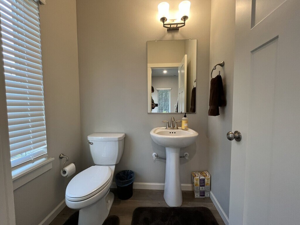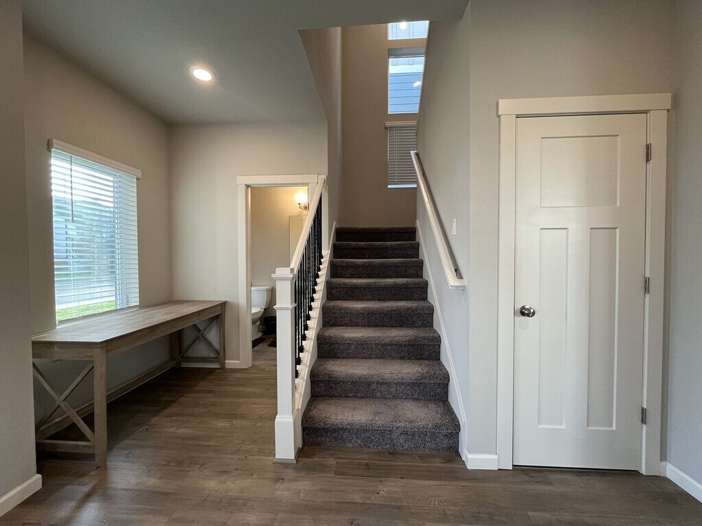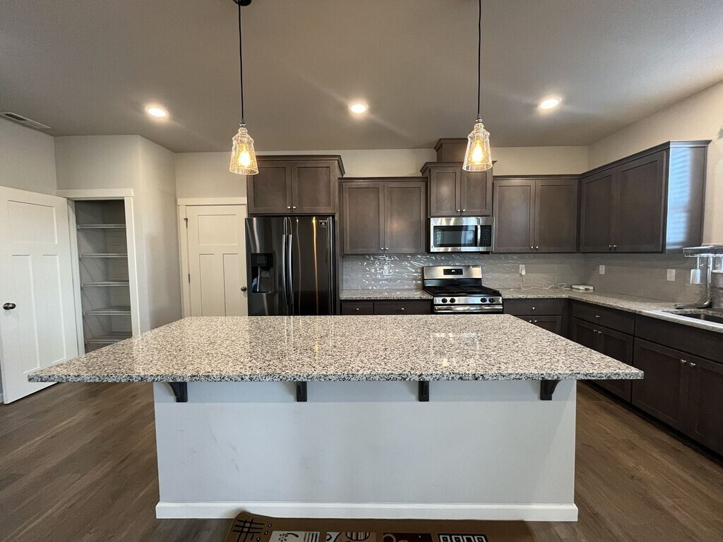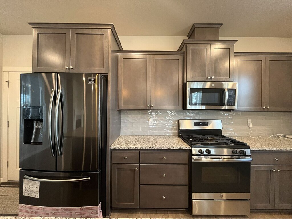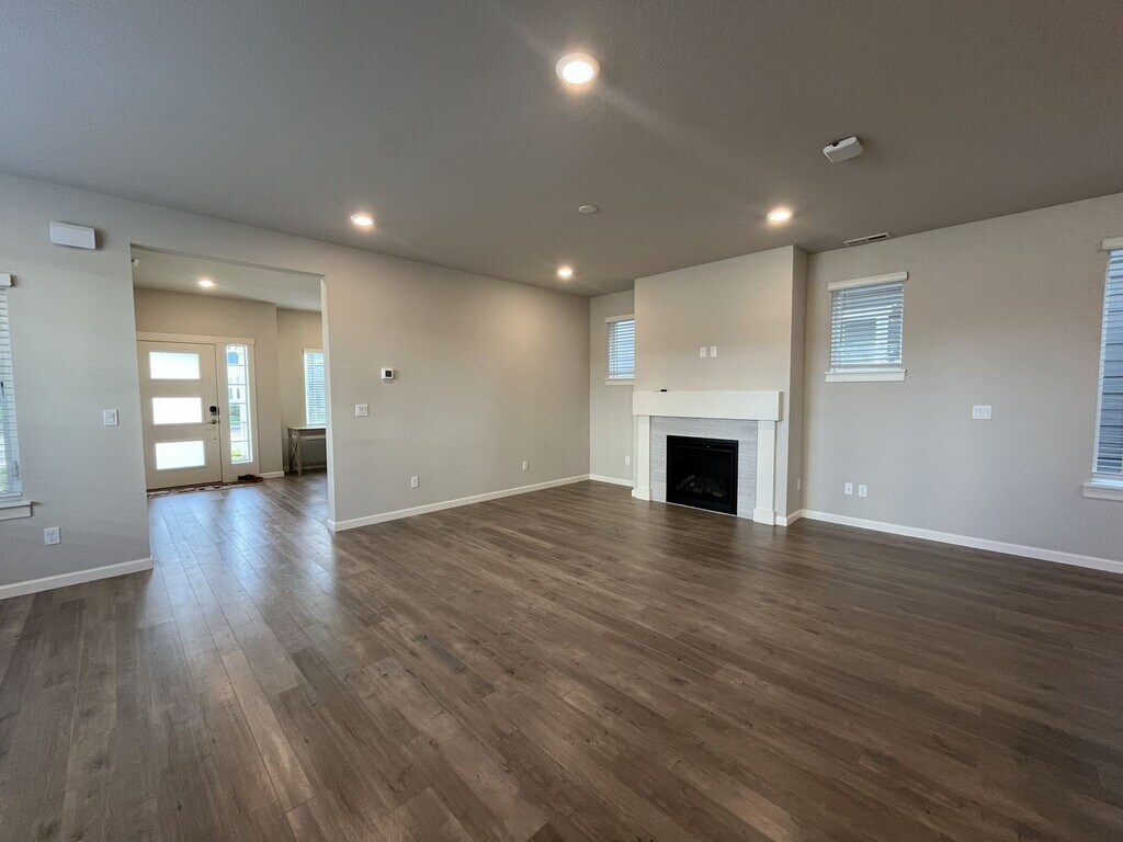 This beautifully maintained three-bedroom, two-and-a-half-bathroom home offers 1,853 square feet of thoughtfully designed living space and sits on a desirable corner lot. The exterior features a charming front lawn framed by small bushes and shrubs, along with a covered front patio that wraps around the side of the home, creating a welcoming and functional outdoor space. Built in 2019 and conveniently located near a newer shopping center, this home blends modern design with everyday convenience. Inside, the bright and open entryway showcases hardwood flooring throughout the main level and includes a dedicated cutout ideal for a console table, shoe rack, or drop zone. The entry also hosts a half bathroom and a staircase that leads to the upper level. The main living area features an open-concept layout that seamlessly connects the living room, dining room, kitchen, and breakfast nook. The kitchen is spacious and modern, centered around a large island that comfortably seats four. It is equipped with stainless steel appliances including a French-door refrigerator, gas stovetop and oven, mounted microwave, dishwasher, and a deep stainless steel sink positioned beneath a window. Dark wood cabinetry lines the kitchen, complemented by a gray subway tile backsplash and generous countertop space. A pantry and large window sit just off the kitchen, creating an ideal spot for a breakfast nook or study desk. The living room is anchored by a gas fireplace that serves as a focal point for the space. On either side of the fireplace are built-in cutouts with tall windows, perfect for bookshelves or display areas while allowing natural light to pour in. Adjacent to the living room, the dining area features a long window along one wall and an additional tall window on the other, making the entire living space bright and inviting. Upstairs, all three bedrooms and two full bathrooms are thoughtfully arranged. The primary suite is spacious and comfortable, featuring carpeted flooring, a tall window, and a walk-in closet. The en suite bathroom includes a long double vanity with two mirrors and a step-in shower with glass doors. The second and third bedrooms are also generously sized, each offering carpeted flooring, long windows, and sliding-door closets. A full bathroom between these bedrooms features a double vanity with a matching long mirror and a tub-and-shower combination. A full-size side-by-side washer and dryer are conveniently located upstairs near the bedrooms, positioned along a wall of bright windows. Additional features include an attached two-car garage, a fenced side yard, and windows throughout the home that fill every room with natural light. Call or Text Our Leasing Agent to schedule a showing! English Speaking Spanish Speaking YouTube Link: Visit our website to apply and view other homes we have available! Do you need property management services? Maximize your income and cut your costs!