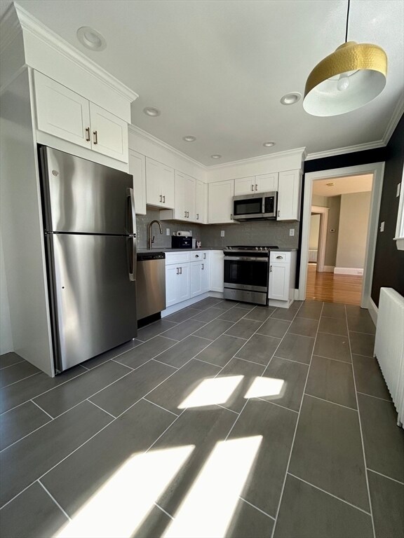 Sunlit,spacious,and full of character - this stunning 3-bed + office/1-bath duplex is Roslindale living at its very best. Spread across two thoughtfully designed levels,the main floor welcomes you with a generous living room and formal dining room adorned with hardwood floors throughout. The newly renovated kitchen and bath strike the perfect balance between modern and charming with the built-in cabinets and stained glass window. The primary bedroom features a large walk-in closet while the versatile den adapts seamlessly to your lifestyle - home office,guest suite,or creative studio. Upstairs,two additional spacious bedrooms offer abundant closet and storage space. Enjoy in-building laundry and off-street parking,as well as a lush backyard offering a peaceful retreat. Located around the corner from the vibrant community energy of Roslindale Village - including boutique shops,celebrated restaurants and cafes,the commuter rail and the Arboretum. MLS# 73494172