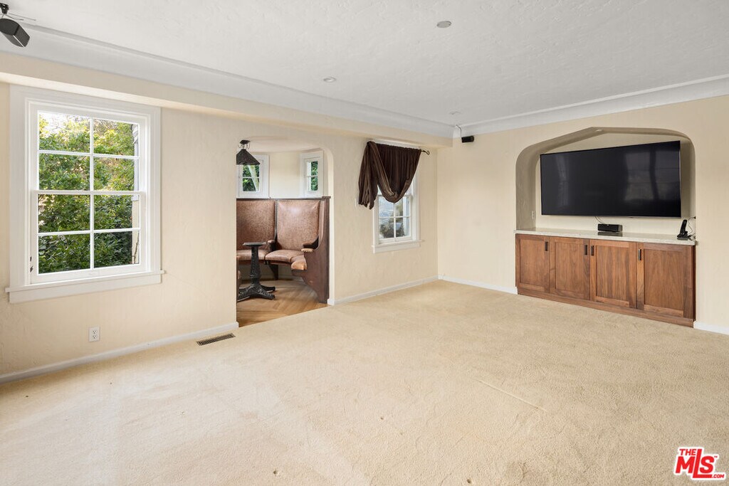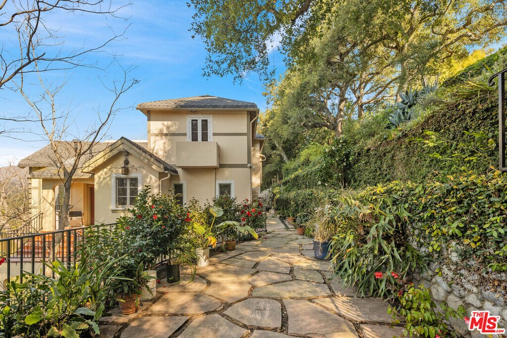 Wonderful opportunity to live in one of the original Uplifters Ranch houses built in 1927. Coddled amongst mature California Oaks, this three level, spacious half-timbered stucco house is placed near the top of the Rustic Canyon rim embracing canyon views from most rooms. When entering the front door one experiences the most impressive ballroom like living room, ordained with a hotel scale fireplace, hardwood and floor to ceiling windows making the ascent worthwhile. The main level also includes the formal dining room, a modern kitchen and office leading all embracing the outdoor gardens. The upper level has three bedrooms and two baths all facing canyon views, including a comfortable main bedroom suite. The lower level with the original unique basement bar and circular card room is part of a family room and is attached to two bedrooms and a bath, potentially can be used as a separate apartment with its own entrance. A two car garage is located at the street level. The house is in the heart of Rustic Canyon adjacent to the Rustic Canyon Park. MLS# 26666821
