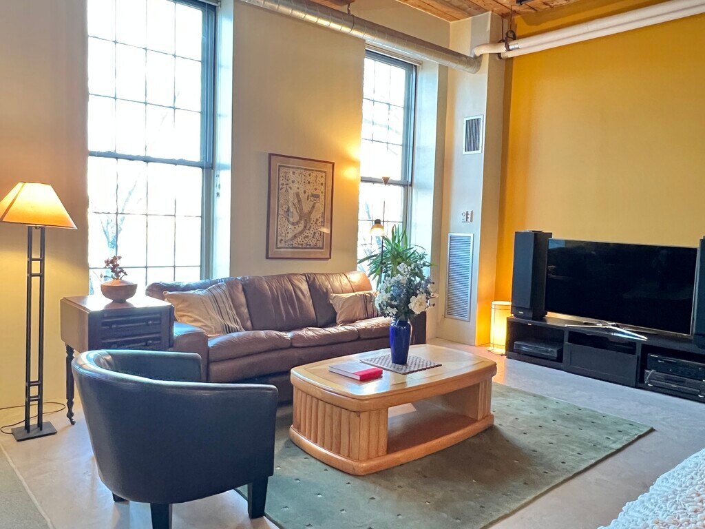 Nothing to do but simply move and unpack into this quiet, beautiful condo. This meticulous 1-bedroom open concept loft with 14' ceilings, river and bridge views offers a modern retreat for those seeking both comfort & sophistication. Rent as furnished or vacant. Stainless-steel appliances and custom island elevate the culinary experience, making meal preparation a delight. The river facing living area offers a gracious setting for relaxation and entertainment. Heat, hot water, gas, sewer, elevator, exterior maintenance, landscaping, snow removal, refuse removal are included in your rent. In-unit washer & dryer, fitness center, recreation room, bike storage, 2 lobby lounges, assigned parking and guest parking, and the riverwalk behind the building makes this prime condo rental not only a statement of refined living but also a strategic location. Near Rt 3, 495, Commuter Rail, UML, downtown restaurants, shops, & entertainment . Must see to truly appreciate. Non-smoking, pet-free unit. 12 month lease minimum. No pets, no smoking. Renter's insurance required. Assigned parking space plus access to guest parking. Tenant responsible for electricity and cable/internet. Tenants must review and comply with the condo Association rules. 2 shelving units, room divider/storage cubes will remain for tenant's use. Total move-in costs = $6300 (1st month's rent, security deposit, last month's rent)