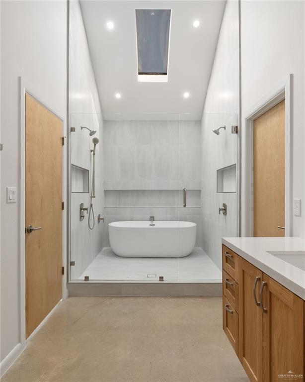 Stunning modern custom home offering 4 bedrooms,3.5 bathrooms,plus a dedicated office and loft area. This open-concept design features soaring 24ft high ceilings,polished concrete floors,high end lighting,and expansive windows for natural light. The kitchen includes custom white oak cabinetry,a large island,premium appliances,and ample storage. Primary suite showcases a spa-style bathroom with walk-in shower and soaking tub. Enjoy seamless indoor-outdoor living with a covered patio and built-in outdoor kitchen,perfect for entertaining. Additional highlights include safe room equipped with large safe,modern bathrooms,generous storage,and a sleek contemporary exterior.