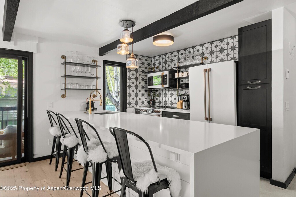 This beautifully renovated condo is a chic mountain retreat! Designed to sleep 8,this 2-bedroom,2-bathroom sanctuary has gourmet appliances,an artisan dining table,gas fireplace,European white oak floors,boutique tiled showers,in-unit laundry and ski-storage. Lounge in the super soft sofa or BBQ and enjoy the fresh mountain air on the private patio. Bedding is 2 kings and 4 twins. Woodbridge amenities include pool,hot tub,1-car common parking. No pets for short-term renters. Short walk to Assay Hill or use the free shuttle. Short-term Rental permit # 058202 Brochure MLS ID 188302