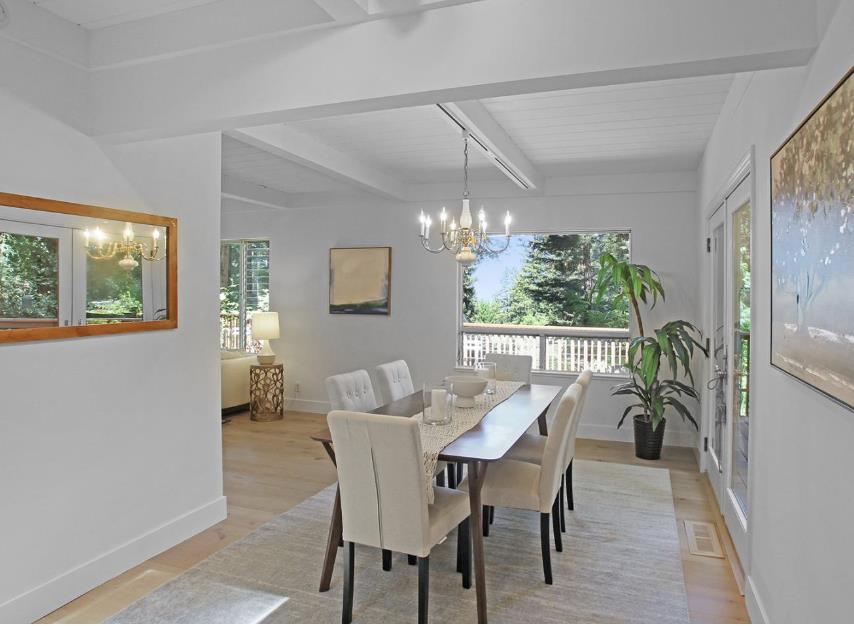 Morning light pours through Redwoods onto white oak floors at this 3 bed/2 bath retreat on 2.44 private acres. Updated kitchen and marble baths blend comfort and style in a rustic a-frame home with enormous deck for indoor-outdoor entertaining or quiet creative time. Barn office and workshop add to the possibilities. Fenced dog run. Redwood fairy ring. Walking paths. 10 minutes to Robert's Market in Woodside, near Stanford, Facebook, Google and Apple (15, 20, 25, 25). Top rated Portola Valley Schools; Sequoia Union High School District.