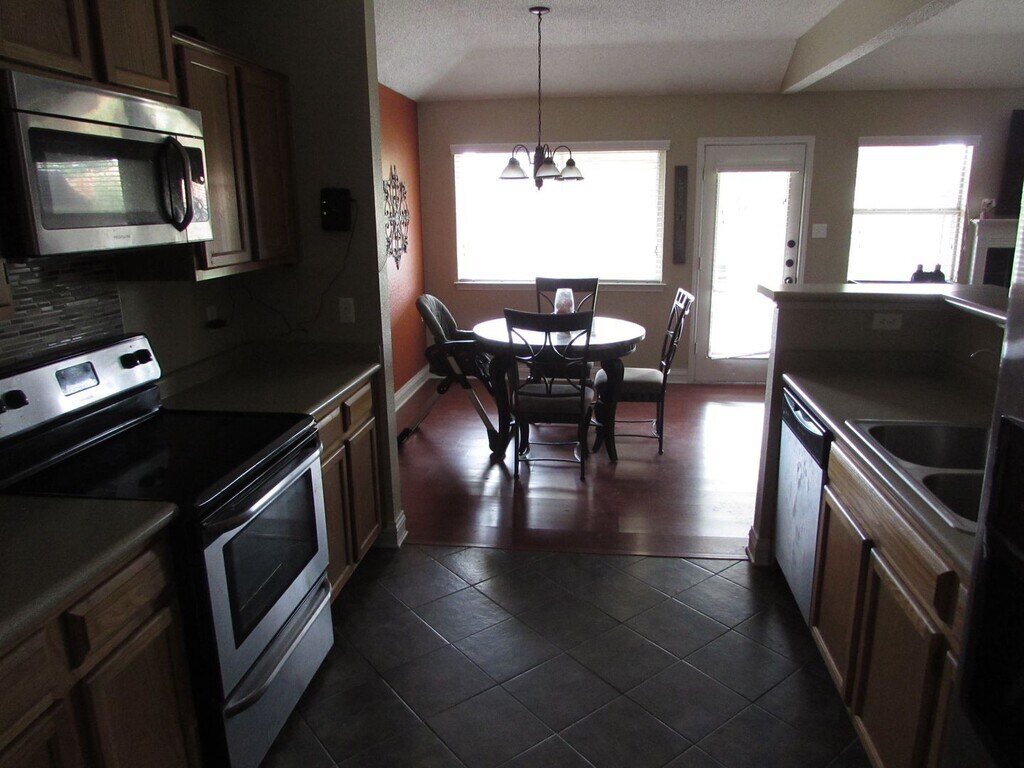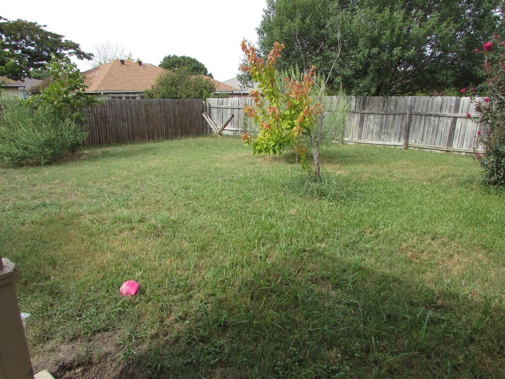 This three bedroom home in Killeen has no carpet! With 1,371 square feet not including the two-car garage this home features: living room with laminate flooring, high ceiling, wood-burning fireplace, door to covered patio and wood-privacy fenced backyard. Open kitchen with ceramic tile flooring, eat-in dining area, electric stainless steel appliances including refrigerator, built-in microwave, dishwasher and stove. Kitchen has glass tiled backsplash behind the kitchen sink and stove including a corner pantry. Primary bedroom has private bathroom with double sinks and tub/shower combo. Secondary bedrooms share a full hallway bath. There is a permanent storage building in the back yard for additional storage. This home is pet friendly, per our policy, with deposit! More photos coming soon.
