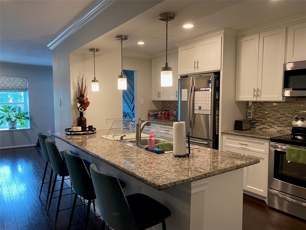 Beautifully renovated/updated. A must see! Proud ownership indeed! Very open concept,with a gorgeous granite countertop/breakfast seating. 42 inch cabinetry,all stainless steel appliances. Formal dining area. Spacious master. Remote black out shade. Walk-in closet with lots of storage. Stylish bath. Beautiful dark laminated flooring. Recess lighting through out. All windows with window seats and nice window treatments. Extra storage closet. All utilities paid. This prime location is within walking distance of beautiful Memorial Park,minutes from Downtown,Midtown and the Galleria areas. Quick access to some of Houston's finest dining,shopping and entertainment,diverse recreation. Like working out...LA Fitness is only minutes away or if you desire...have a lustrous spa day at the radiant Houstonian located just a few blocks away. Easy access to I-10 and 610. MLS# 83257861