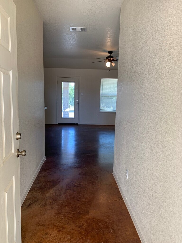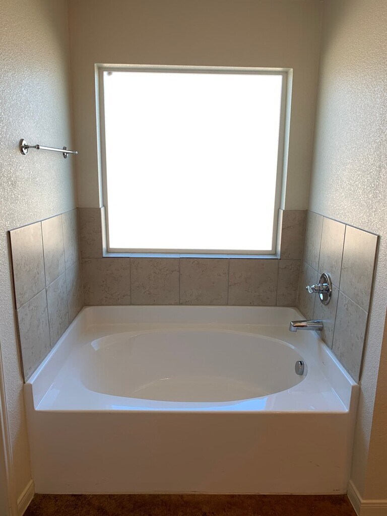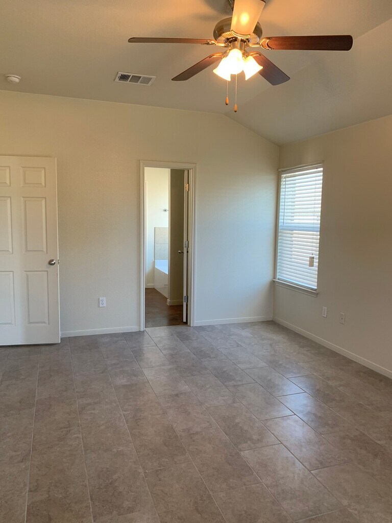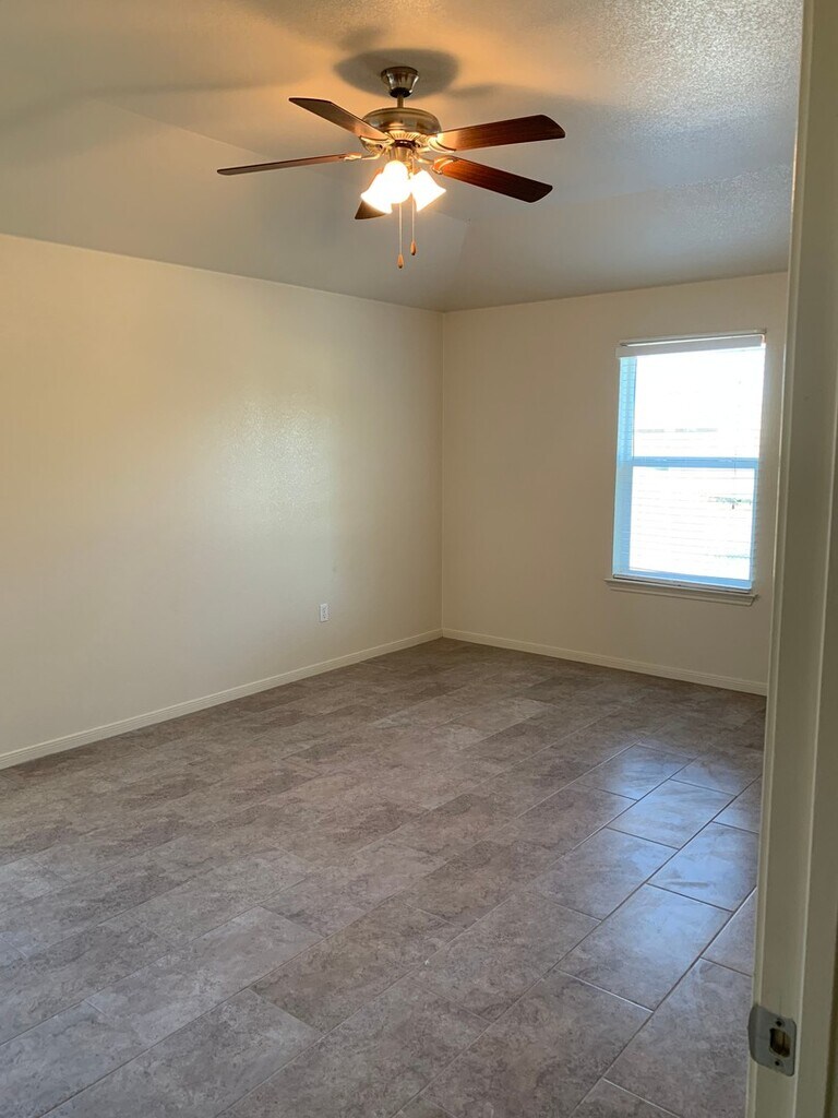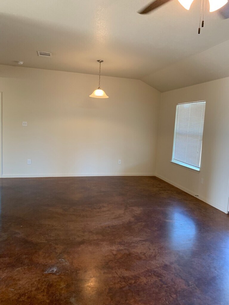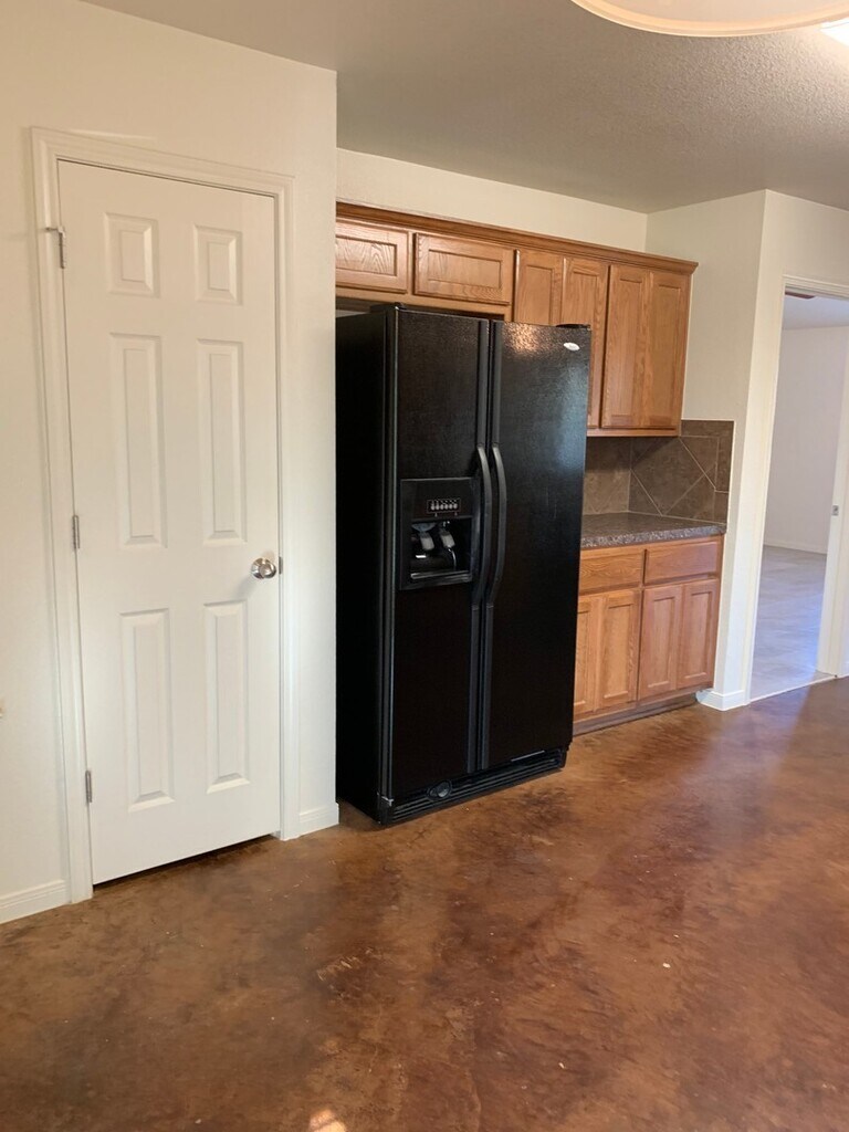 4 bedroom 2.25 bath home boasting ample living space! Through the entry - walk in to the living area with kitchen and dining off to the side. Kitchen features eat in dining area and a great amount of cabinet and counter space. Black appliances throughout the kitchen. Split floor plan with master suite featuring a walk in closet, marble double vanity, garden tub and separate shower. Spare bedrooms and hall bath at the other side of the home have great lighting and generous room sizes. Back yard is great for entertaining with an extended patio and fully fenced in yard. Home features stained concrete and will have upgraded tile floors in the bedrooms after the remodel!